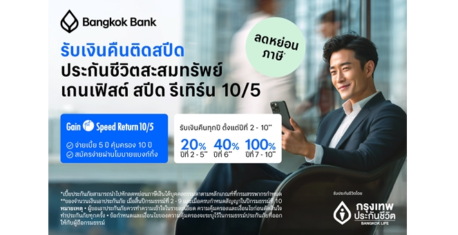 กรุงเทพประกันชีวิต ร่วมกับธนาคารกรุงเทพ เปิดแผนประกันชีวิตใหม่ เกนเฟิสต์ สปีด รีเทิร์น 10/5 ชูจุดเด่นอัตราผลตอบแทนสูง รับเงินคืนไวในระหว่างสัญญา