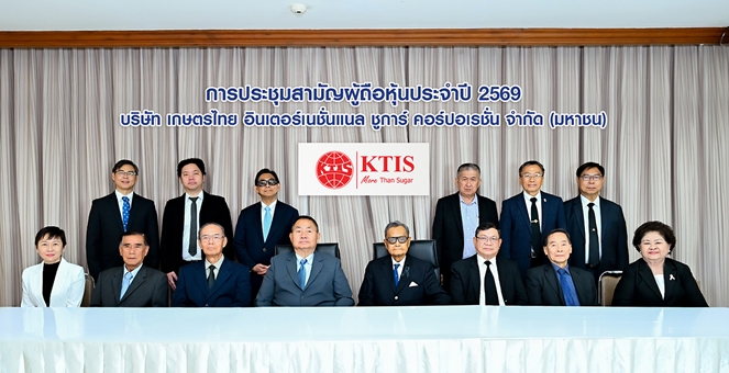 สำนักข่าวอีไฟแนนซ์ไทย- -28 ม.ค. 69 9:51: น. นายปรีชา อรรถวิภัชน์ ประธานกรรมการ นายประพันธ์ ศิริวิริยะกุล ประธานเจ้าหน้าที่บริหารกลุ่ม พร้อมคณะกรรมการ บริษัท เกษตรไทย อินเตอร์เนชั่นแนล ชูการ์ คอร์ปอเรชั่น จำกัด (มหาชน) หรือกลุ่ม KTIS ผู้นำในอุตสาหกรรมน้ำตาลและอุตสาหกรรมต่อเนื่องครบวงจร เข้าร่วมการประชุมสามัญผู้ถือหุ้นประจำปี 2569 เพื่อรับทราบผลประกอบการและแนวโน้มอุตสาหกรรม โดยคาดว่า ผลผลิตอ้อยในฤดูกาลผลิตปี 2568/2569 มีแนวโน้มที่ดีขึ้น ขณะที่อุตสาหกรรมที่เกี่ยวข้อง เช่น อุตสาหกรรมผลิตภาชนะจากชานอ้อย