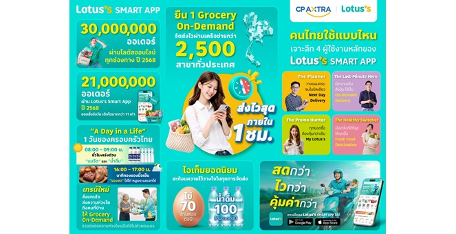 star_borderModal Upgrade Packageโลตัส สร้างยอด 30 ล้านออเดอร์ออนไลน์ ปี 2568 ส่งผ่านออนไลน์ทุกช่องทาง ดัน Lotus’s Smart App ยืน 1 Grocery On-Demand จัดส่งไวสุดภายใน 1 ชั่วโมง26 Feb 2026 17:08