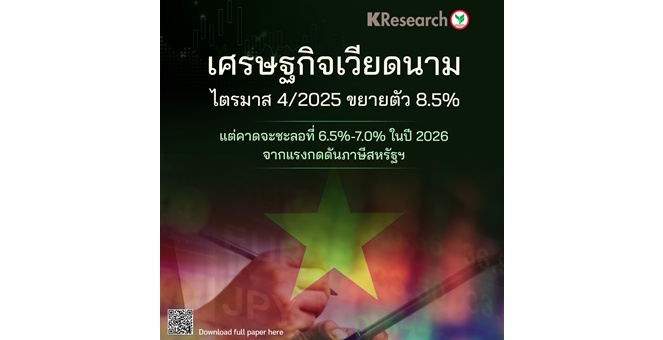 star_borderModal Upgrade Packageศูนย์วิจัยกสิกรไทย เผยเศรษฐกิจเวียดนามไตรมาสที่ 4/2025 ขยายตัว 8.5% แต่คาดชะลอที่ 6.5%-7.0% ในปี 2026 จากแรงกดดันภาษีสหรัฐฯ9 Jan 2026 17:14