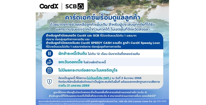 star_borderModal Upgrade Packageคาร์ดเอกซ์ ออกมาตรการเพิ่มเติมช่วยเหลือลูกค้าที่ได้รับผลกระทบรุนแรงจากอุทกภัยภาคใต้ หนุนฟื้นตัวทางการเงินโดยเร็ว9 Jan 2026 11:42