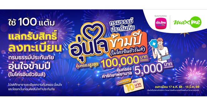 star_borderModal Upgrade Packageเมืองไทยประกันชีวิต จับมือ แมกซ์ โซลูชัน เซอร์วิส เพิ่มความอุ่นใจแก่สมาชิก Max Card ต้อนรับเทศกาลปีใหม่ ผ่าน “กรมธรรม์ประกันภัยอุ่นใจข้ามปี (ไมโครอินชัวรันส์)”25 Dec 2025 13:53