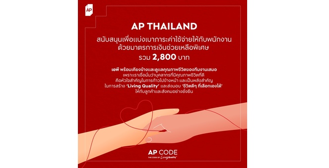 star_borderModal Upgrade Packageเอพี ไทยแลนด์ เดินหน้าเคียงข้างดูแลคุณภาพชีวิตพนักงาน สนับสนุนเงินช่วยเหลือพิเศษเดือนเมษายน รวม 2,800 บาท ร่วมเป็นส่วนหนึ่งเพื่อแบ่งเบาภาระค่าใช้จ่าย2 Apr 2026 17:05