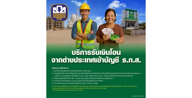 star_borderModal Upgrade Packageธ.ก.ส. ยกระดับบริการรับเงินโอนจากต่างประเทศเข้าบัญชี ธ.ก.ส. ได้ตลอด 24 ชั่วโมง สูงสุด 500,000 บาท2 Apr 2026 09:49