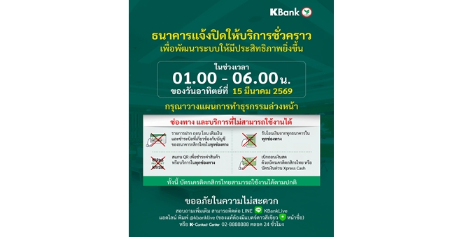 star_borderModal Upgrade Packageกสิกรไทย แจ้งปิดปรับปรุงระบบชั่วคราว ช่วง 01:00 - 06:00 น. ของวันที่ 15 มี.ค. 6910 Mar 2026 10:34