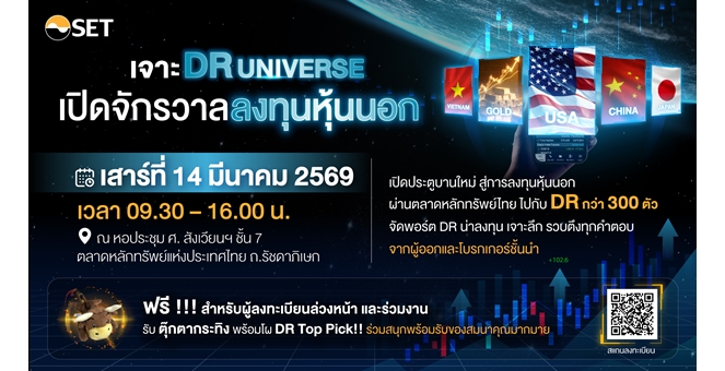 star_borderModal Upgrade Packageตลาดหลักทรัพย์ฯ ชวนร่วมสัมมนา “เจาะ DR Universe เปิดจักรวาลลงทุนหุ้นนอก” เสาร์ที่ 14 มี.ค. นี้10 Mar 2026 10:52