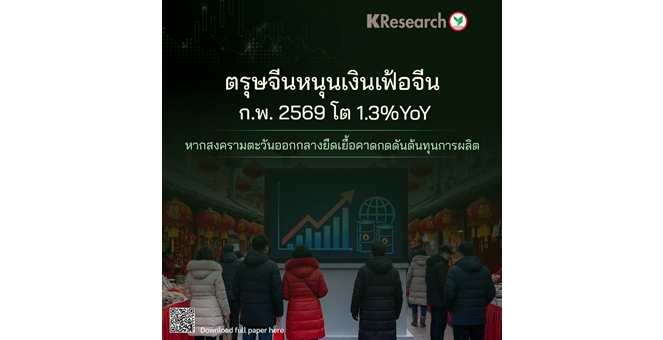 star_borderModal Upgrade Packageศูนย์วิจัยกสิกรฯ เผยตรุษจีนหนุนเงินเฟ้อจีน ก.พ.69 โต 1.3%YoY หากสงครามตะวันออกกลางยืดเยื้อคาดกดดันต้นทุนการผลิต10 Mar 2026 11:44