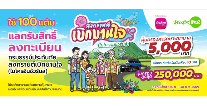 star_borderModal Upgrade Packageเมืองไทยประกันชีวิต จับมือ แมกซ์ โซลูชัน เซอร์วิส ส่ง “กรมธรรม์ประกันภัยสงกรานต์เบิกบานใจ 10 บาท (ไมโครอินชัวรันส์)” เพิ่มความอุ่นใจแก่สมาชิก Max Card ช่วงเทศกาลสงกรานต์7 Apr 2026 16:43