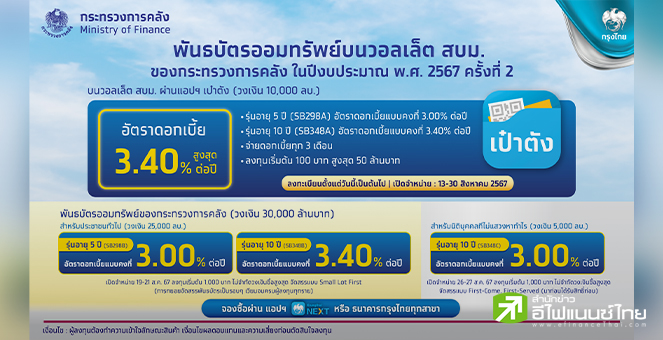 ธนาคารกรุงไทย เดินหน้าตอบโจทย์ผู้ลงทุน สร้างความมั่นคงทางการเงิน เตรียมเสนอขายพันธบัตรออมทรัพย์วอลเล็ต สบม. ของกระทรวงการคลัง ในปีงบประมาณ พ.ศ. 2567 ครั้งที่ 2 ผ่านแอปฯ เป๋าตัง จำนวน 2 รุ่น วงเงิน 10,000 ล้านบาท รุ่นอายุ 5 ปี ดอกเบี้ยคงที่ 3 % ต่อปี และรุ่นอายุ 10 ปี ดอกเบี้ยคงที่ 3.40% ต่อปี ลงทุนง่าย เริ่มต้นเพียง 100 บาท ส่งเสริมคนไทยออมเงินอย่างทั่วถึงและยั่งยืน เตรียมเสนอขายวันที่ 13-30 สิงหาคมนี้ นายรวินทร์ บุญญานุสาสน์ ผู้บริหารสายงานธุรกิจตลาดเงินตลาดทุน ธนาคารกรุงไทย เปิดเผยว่า ในฐานะธนาคารพาณิชย์ชั้นนำของประเทศ