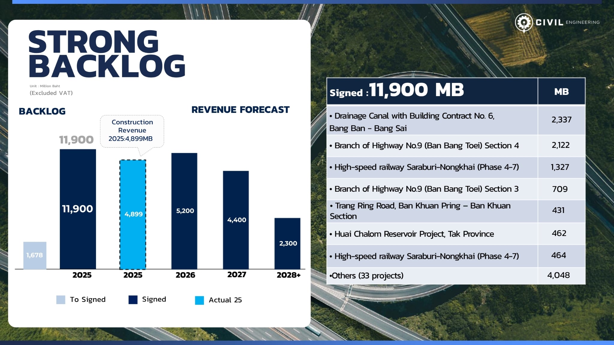 ในระยะยาว CIVIL ยังมองเห็นโอกาสจากงานโครงสร้างพื้นฐานขนาดใหญ่ของประเทศ ไม่ว่าจะเป็นโครงการทางหลวง โครงการ PPP ระบบราง และโครงการพลังงาน ซึ่งรวมแล้วมีมูลค่าโครงการใน pipeline หลายหมื่นล้านบาท และอาจเป็นปัจจัยสนับสนุนการเติบโตของบริษัทในระยะต่อไป
