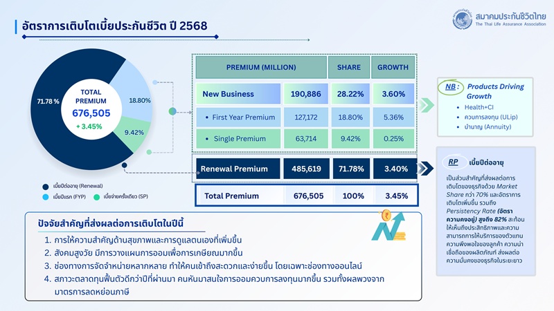 นางนุสรา (อัสสกุล) บัญญัติปิยพจน์ นายกสมาคมประกันชีวิตไทย เปิดเผยว่า ภาพรวมธุรกิจประกันชีวิตของปี 68 ระหว่าง มกราคม – ธันวาคม มีเบี้ยประกันภัยรับรวม(Total Premium) อยู่ที่ 676,505 ล้านบาท เติบโตเพิ่มขึ้น 3.45% เมื่อเทียบกับปี 2567 จำแนกเป็น เบี้ยประกันภัยรับรายใหม่ (New Business Premium) 190,886 ล้านบาท อัตราการเติบโตเพิ่มขึ้นะ 3.60% และ เบี้ยประกันภัยรับปีต่อไป(Renewal Premium) 485,619 ล้านบาท มีอัตราการเติบโตเพิ่มขึ้น 3.40% คิดเป็นอัตราความคงอยู่ของกรมธรรม 82%