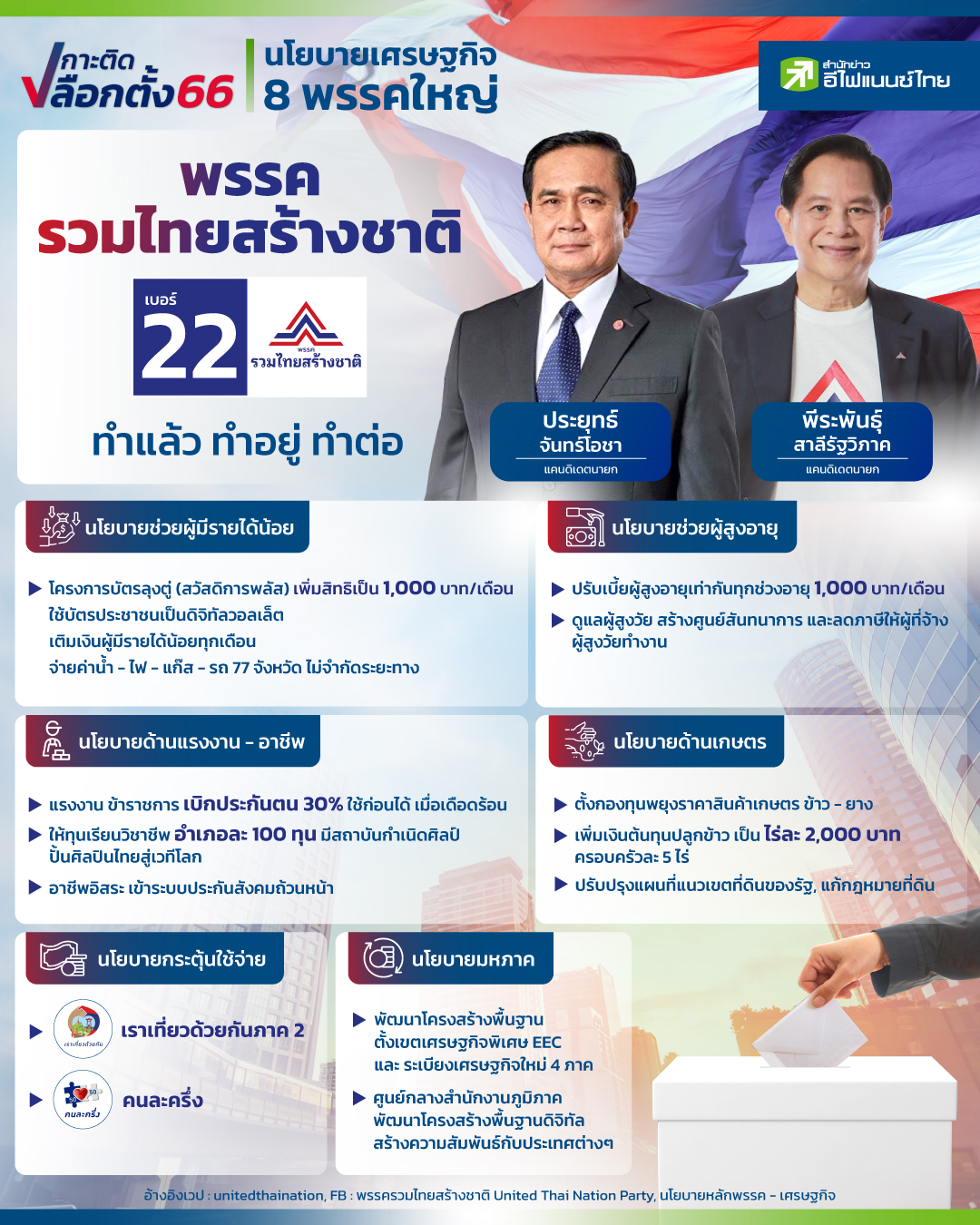 พรรค "รวมไทยสร้างชาติ" เป็นหนึ่งพรรคที่ถูกจับตามองเป็นอย่างมาก เนื่องจากมีแคนดิเดตนายกรัฐมนตรี อย่าง "พล.อ.ประยุทธ์ จันทร์โอชา" นายกรัฐมนตรีคนปัจจุบัน เป็นตัวชูโรงของพรรค และมี"พีระพันธุ์ สาลีรัฐวิภาค" เลขานายกฯ มานั่งเป็นหัวหน้าพรรค พร้อมกับดึงบรรดานักการเมืองจอมเก๋าหลายคน ที่เชื่อมั่นในตัวพล.อ.ประยุทธ์ มาร่วมพรรคกันอย่างคับคั่ง ทำให้คาดการณ์ว่า พรรคนี้น่าจะมีบทบาททางการเมืองต่อจากนี้อยู่พอสมควร หันมาดูนโยบายการหาเสียงด้านเศรษฐกิจของ "รวมไทยสร้างชาติ" มีทั้งการต่อยอดนโยบายเดิมที่รัฐบาลพล