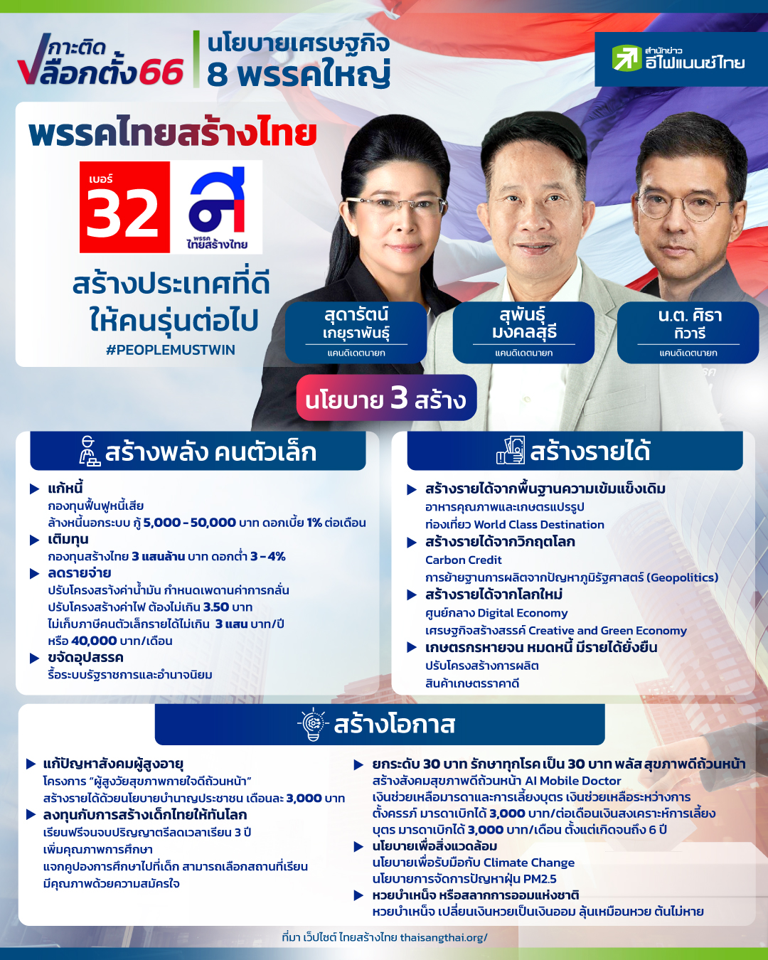 พรรคไทยสร้างไทย ภายใต้แกนนำของ คุณหญิงสุดารัตน์ เกยุราพันธุ์ ที่น่าจะเป็นอีกหนึ่งพรรคที่ได้รับความสนใจ ซึ่งนโยบายที่พรรคไทยสร้างไทยหยิบยกมา ครอบคลุมทั้งด้านเศรษฐกิจ และสังคม ซึ่งจากการรวบรวมข้อมูลของ “สำนักข่าวอีไฟแนนซ์ไทย” พบว่า พรรคไทยสร้างไทย มาในนโยบาย 3 สร้าง คือ สร้างพลัง สร้างรายได้ และสร้างโอกาส โดยทุกนโยบายล้วนเป็นนโยบายที่น่าสนใจ นอกจากนี้ พรรคไทยสร้างไทย ครั้งนี้ยังมีอีก 2 แคนดิเดตนายกฯ นอกจากคุณหญิงสุดารัตน์ นั่นก็คือ นายสุพันธ์ มงคลสุธี และ น.ต. ศิธา ทิวารี ด้วย