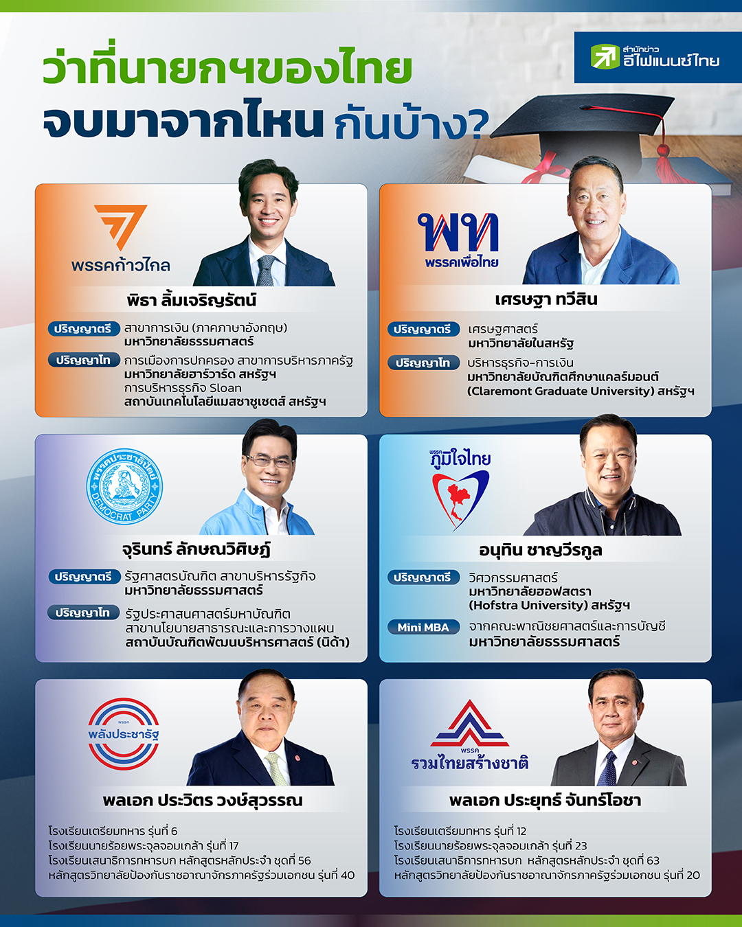 หลายคนอาจจะสงสัยว่า หากจะเป็นนายกรัฐมนตรี? หรือ ผู้นำสูงสุดทางการเมืองของประเทศไทยนั้น จะต้องจบมาจากไหน ถึงดำรงตำแหน่งดังกล่าวได้ โดยวันนี้ “สำนักข่าวอีไฟแนนซ์ไทย” จึงได้ทำการรวบรวมข้อมูล ของบรรดาตัวอย่างแคนดิเดตนายกรัฐมนตรีของแต่พรรค ว่า ว่าที่นายกฯ ของไทยที่จะได้เห็นในเร็วๆนี้ จบจากคณะอะไร จากมหาวิทยาลัยไหนบ้าง เรียกว่า ช่วงนี้ ถือว่าเป็นช่วงโค้งสุดท้ายของศึกเลือกตั้ง โดยที่ผ่านมา “สำนักข่าวอีไฟแนนซ์ไทย” ได้นำเสนอประเด็นการเลือกตั้งมาอย่างต่อเนื่อง ตั้งแต่เบอร์ของแต่ละพรรค