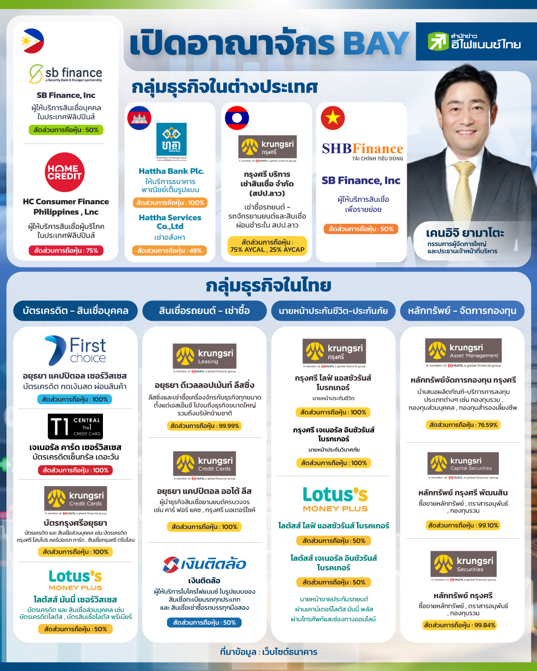การเติบโตในประเทศอาจไม่เพียงพอในยุคปัจจุบันเสียแล้ว ซึ่งจะเห็นว่า "ธนาคารพาณิชย์" ได้ขยายการลงทุนไปในต่างประเทศมากขึ้น ทั้งการเข้าซื้อกิจการ หรือ การร่วมทุน โดยหากพูดถึงธนาคารที่มีการเข้าซื้อกิจการมากที่สุด ชื่อ ธนาคารกรุงศรีอยุธยา จำกัด(มหาชน) หรือ BAY ต้องมาอันดับ 1 เนื่องจากที่ผ่านมา ธนาคารมีนโยบายชัดเจนที่จะเชื่อมโยงลูกค้าทั่วทั้งภูมิภาคอาเซียน "สำนักข่าวอีไฟแนนซ์ไทย" ได้รวบรวมบริษัทบางส่วนในเครือของธนาคารกรุงศรีอยุธยา ซึ่งมีทั้งในประเทศ และ ต่างประเทศ เอาไว้ดังนี้