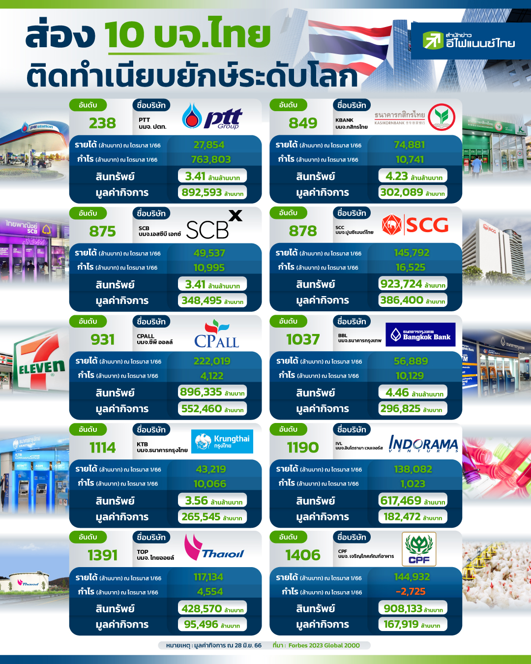 ปัจจุบันพบว่า บริษัทไทยมีการเติบโตขึ้นอย่างต่อเนื่อง โดยมีจำนวนไม่น้อยที่ติดการจัดอันดับที่ใหญ่ที่สุดในโลกจำนวน 2,000 อันดับ จากการจัดอันดับของ ฟอร์บส โดยล่าสุด ฟอร์บส ได้เปิดเผยรายงานการจัดอันดับบริษัทที่ใหญ่ที่สุดในโลกจำนวน 2000 อันดับประจำปีนี้ (2023 The Global 2000) ซึ่งพบว่า มีทั้งหมด 17 บริษัทด้วยกันที่ติดโผดังกล่าว สำหรับในวันนี้ “สำนักข่าวอีไฟแนนซ์ไทย” ได้นำข้อมูลบริษัทจดทะเบียน 10 อันดับแรกที่อยู่ในไทย ที่ติดการจัดอันดับที่มีขนาดใหญ่ที่สุดในโลก โดยพิจารณาจากตัวเลขสินทรัพย์ และมูลค่าตลาด
