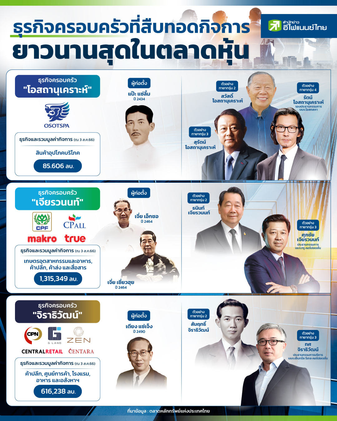 "มหาเศรษฐีของไทย" หลายตระกูล มักก่อตั้งขึ้นจากธุรกิจครอบครัวเล็กๆ ซึ่งสืบทอดความมั่งคั่งจากรุ่นสู่รุ่นหรือการบริหารจัดการมักเป็นคนในตระกูลเดียวกันจนกลายเป็นอาณาจักรใหญ่โตในปัจจุบัน โดยล่าสุดตลาดหลักทรัพย์แห่งประเทศไทย (ตลท.) ได้เปิดเผยข้อมูลในตลาดหุ้น ซึ่งพบว่ามีบริษัทจดทะเบียนไทย (บจ.) ที่เป็นธุรกิจครอบครัวจำนวนกว่า 451 บริษัท หรือคิดเป็นสัดส่วน 57% ของบจ.ทั้งหมด โดยมีมูลค่าหลักทรัพย์ตามราคาตลาด (มาร์เก็ตแคป) รวมกันประมาณ 8 ล้านล้านบาท หรือคิดเป็น 43% ของมูลค่ามาร์เก็ตแคปทั้งหมด และมีอายุเฉลี่ยของบริษัทเหล่านี้อยู่ที่ประมาณ