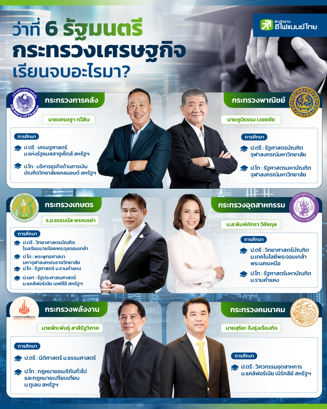 หลังจากโปรดเกล้า นายเศรษฐา ทวีสิน เป็นนายกรัฐมนตรีคนที่ 30 กระบวนการถัดไปคือการ การแต่งตั้งคณะรัฐมนตรี (ครม.) ซึ่งเร็วๆ นี้คาดว่าจะได้เห็นโฉมหน้าของรัฐมนตรีกระทรวงต่างๆ อย่างเป็นทางการ โดยสำนักข่าวหลายแห่งได้เปิดเผยโผว่าที่ รมว. และรมช. รวมถึงตำแหน่งรองนายกฯ ให้พอทราบถึงผู้ที่จะเข้ารับดำรงตำแหน่งกันบ้างแล้ว "สำนักข่าวอีไฟแนนซ์ไทย" จึงได้รวบรวมโฉมหน้าของว่าที่ 6 รัฐมนตรีกระทรวงเศรษฐกิจที่สำคัญ ว่าจบการศึกษาจากที่ใดบ้าง ซึ่งจะมีแนวทางตรงกับตำแหน่งบริหารในแต่ละกระทรวงหรือไม่