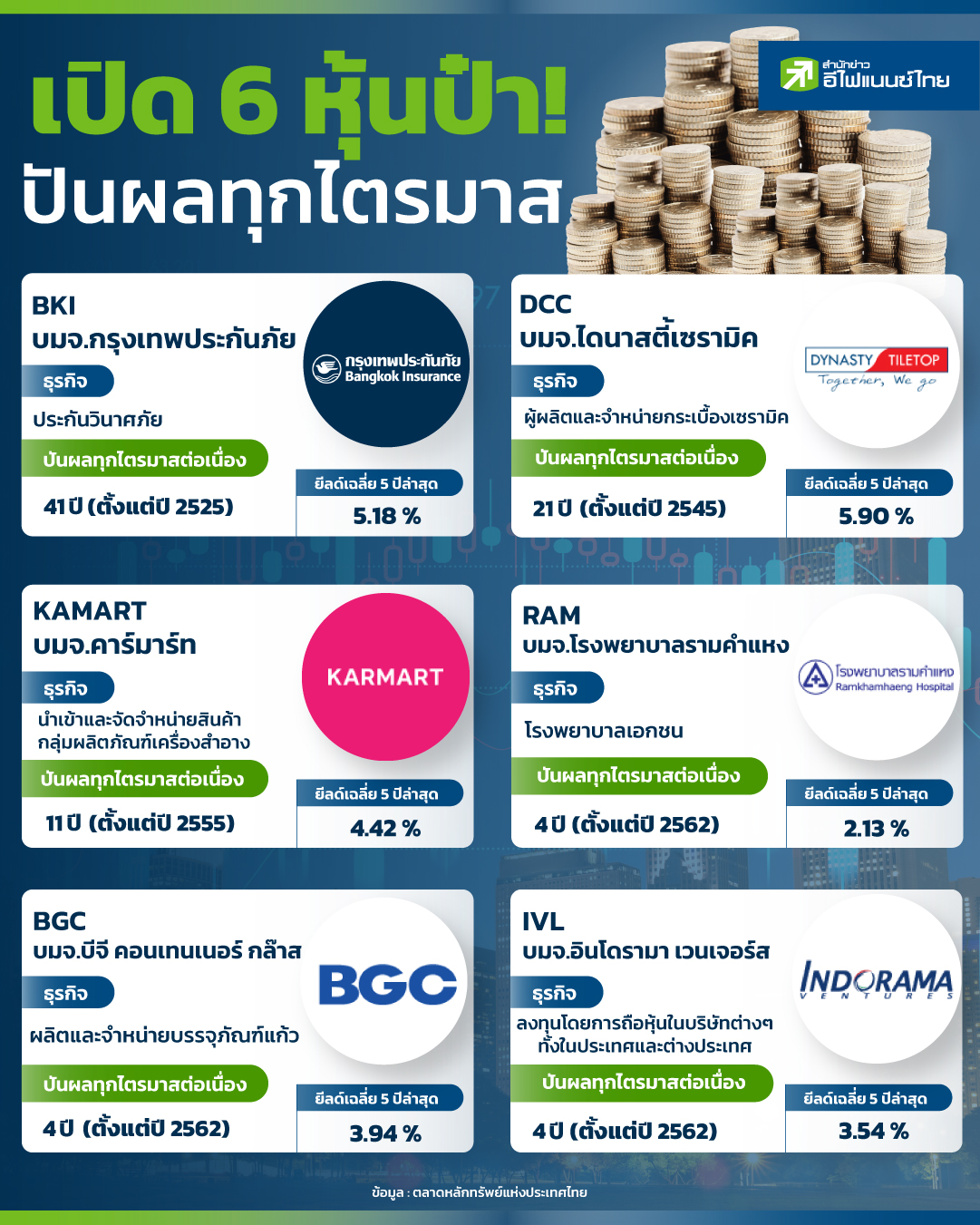 ในช่วงเวลานี้ที่ตลาดหุ้นดิ่งต่อเนื่องจดหลุดที่ระดับ 1,400 จุด และบรรดานักวิเคราะห์เองก็ไม่สามารถคาดเดาได้ว่า ดัชนีหุ้นไทยจะไป Bottom ที่เท่าไหร่ ดังนั้นกลยุทธ์ในการลงทุนช่วงนี้ จึงเน้นถือเงินสดบางส่วน และอีกส่วนคือ การเลือกหุ้นที่ผลประกอบการมีแนวโน้มเติบโตดีในปีหน้า หรือหุ้นที่ให้ผลตอบแทนอย่างต่อเนื่อง โดยในวันนี้ "สำนักข่าวอีไฟแนนซ์ไทย" ได้ทำการสำรวจหุ้นที่ให้ผลตอบแทน หรือ เงินปันผลต่อเนื่องมาเป็นเวลานาน และที่สำคัญ คือ ยังปันผลทุกไตรมาสด้วย จะมีหุ้นไหนบ้าง แต่ทั้งนี้