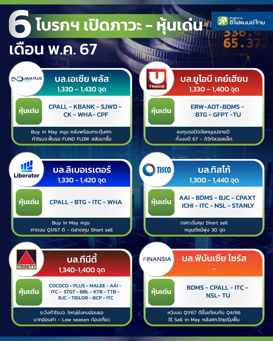 6 โบรกฯ เปิดภาวะ - หุ้นเด่น เดือน พ.ค. 67