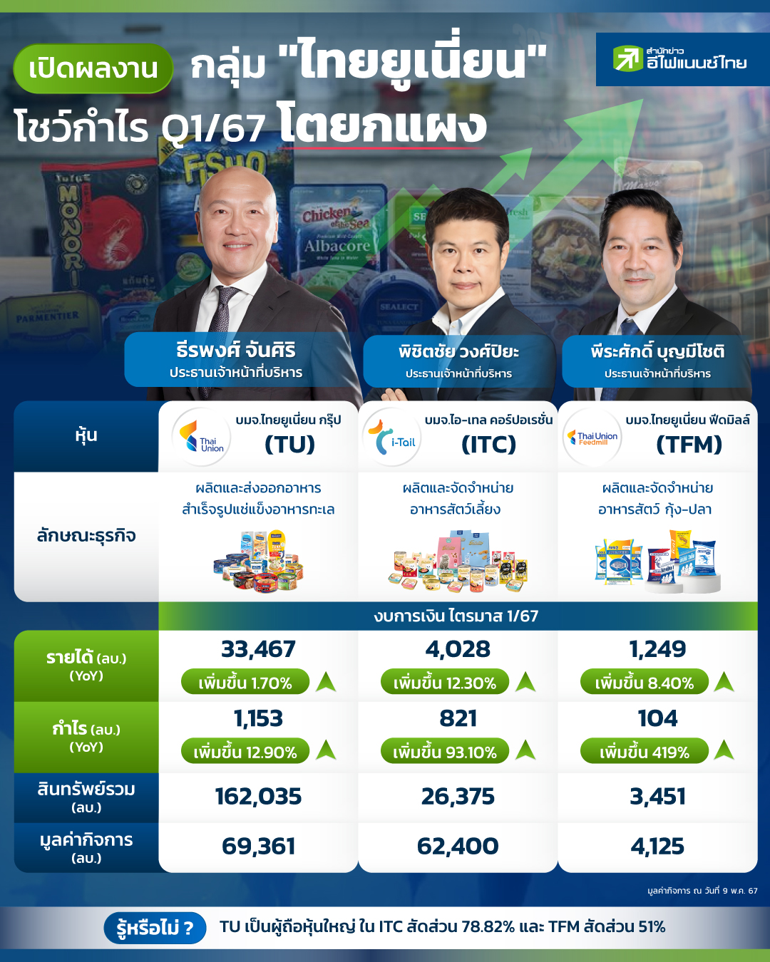 หากจะพูดถึงอาหารแช่แข็ง อาหารแปรรูป หรืออาหารทะเลของไทย คงไม่มีใครไม่รู้จัก บริษัท ไทยยูเนี่ยน กรุ๊ป จำกัด (มหาชน) หรือ TU เพราะถือเป็นหนึ่งในบริษัทอาหารทะเลของไทยที่ไม่ใช่ขายในประเทศเท่านั้น แต่ยังกระจายไปยังประเทศอื่นๆ ทั่วโลกด้วย และนอกเหนือจากธุรกิจอาหารทะเลแล้ว TU ยังได้ขยายการลงทุนไปยังธุรกิจอาหารประเภทอื่นๆ เช่น ผู้ผลิตและจำหน่ายอาหารสัตว์เลี้ยง และอาหารสัตว์เศรษฐกิจ เช่น กุ้ง,ปลา และสัตว์บก เป็นต้น โดยวันนี้ "สำนักข่าวอีไฟแนนซ์ไทย" จึงได้เปิดผลงานกลุ่ม "ไทยยูเนี่ยน" ทั้ง