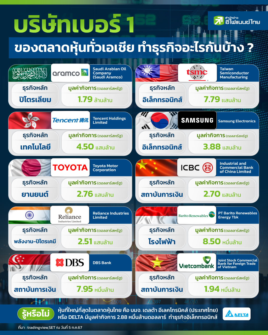 ปัจจุบันภาพรวมตลาดหุ้นไทย มีหุ้น บมจ.เดลต้า อีเลคโทรนิคส์ (ประเทศไทย) หรือ DELTA เป็นหุ้นที่มีมูลค่ากิจการมากที่สุด 1.05 ล้านล้านบาท หรือ 2.88 หมื่นล้านดอลลาร์ ซึ่งทำธุรกิจด้านอิเล็กทรอนิกส์ แต่ภาพรวมเบอร์ 1 ของตลาดหุ้นในทวีปเอเชีย ต่างมีผู้นำที่ประกอบธุรกิจแตกต่างกันออกไป "สำนักข่าวอีไฟแนนซ์ไทย" จึงได้รวบรวมบจ.เบอร์ 1 ของตลาดหุ้นทั่วเอเชีย ว่าทำธุรกิจอะไรกันบ้าง ดังนี้