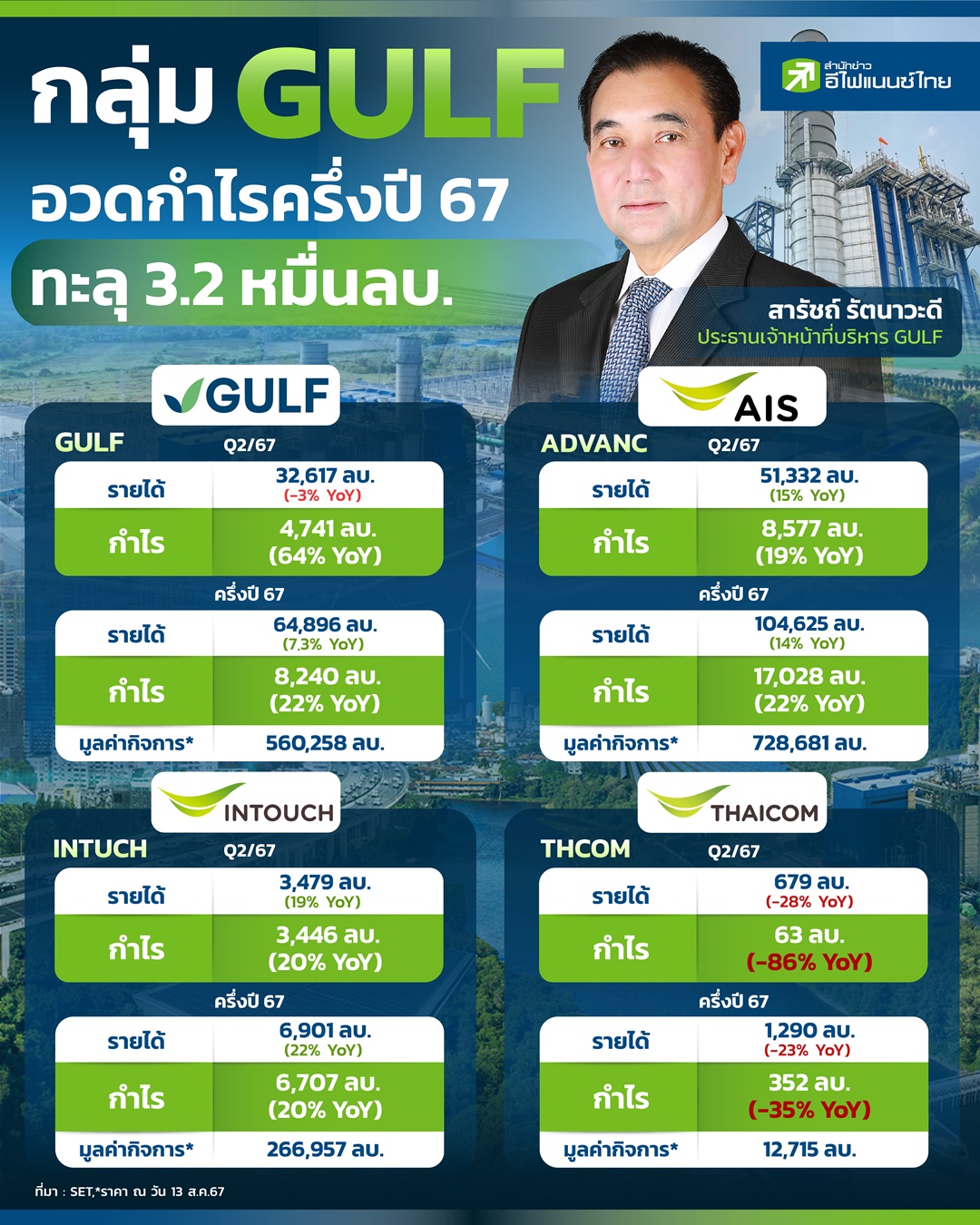 กลุ่ม GULF อวดกำไรครึ่งปี 67 ทะลุ 3.2 หมื่นลบ.