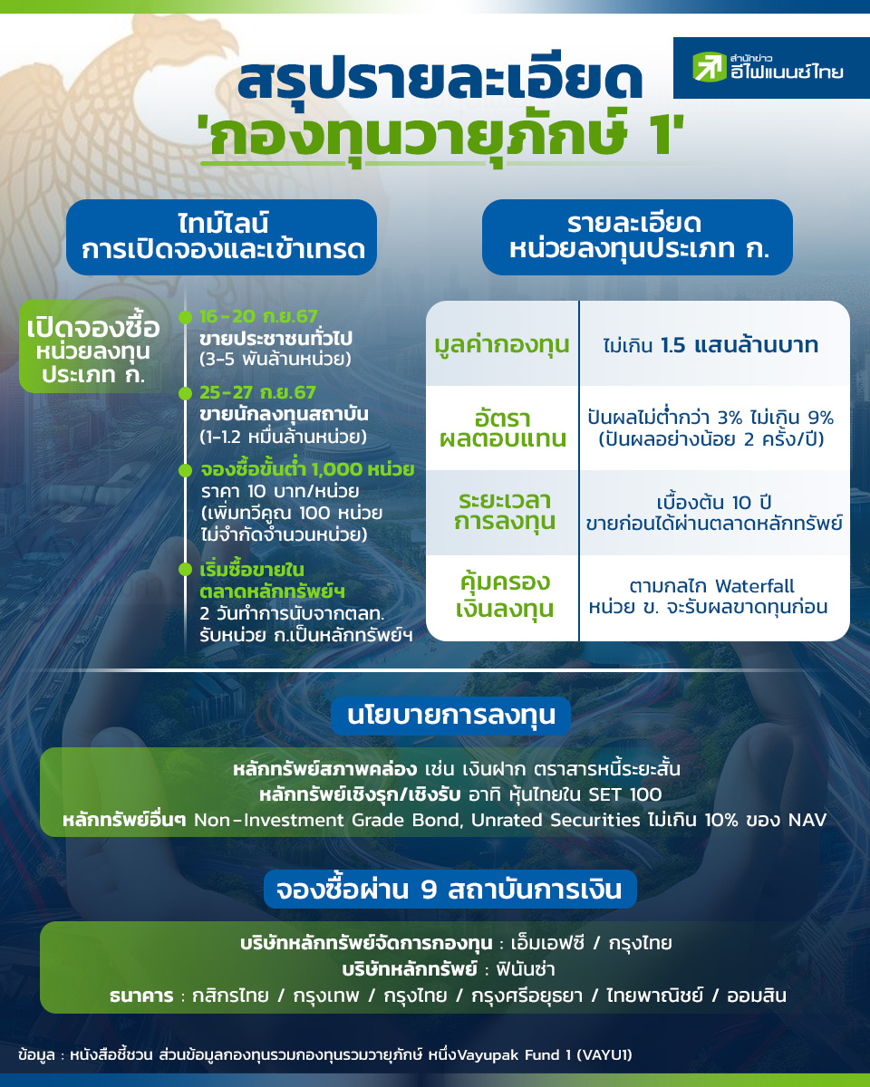 เปิดตัวหนังสือชี้ชวนมาแล้ว สำหรับกองทุนรวมวายุภักษ์ 1 กองทุนที่นักลงทุนและตลาดหุ้นไทยเฝ้ารอ และคาดหวังว่าจะเป็นพระเอกที่จะมาช่วยฟื้นตลาดหุ้นไทยในช่วงปลายปีนี้ เนื่องจากจะเป็นกองทุนที่เปิดให้ประชาชนทั่วไปลงทุน ด้วยจุดเด่นการคุ้มครองเงินต้น และปันผลระดับ 3-9% และคาดว่าจะมีเม็ดเงินเข้ามาช่วยตลาดหุ้นถึง 1.5 แสนล้านบาท' "สำนักข่าวอีไฟแนนซ์ไทย" จึงได้สรุปประเด็นสำคัญ จากหนังสือชี้ชวน ว่า ประชาชนทั่วไป จะได้ฤกษ์จับจองกองทุนนี้เมื่อไหร่ และทางไหนบ้าง รวมถึงนโยบายการลงทุนเป็นอย่างไร