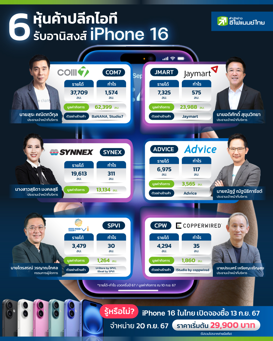 เปิดตัวแล้วสำหรับ iPhone16 ซึ่งในไทยเตรียมเปิดจองวันศุกร์ที่ 13 ก.ย.นี้ ก่อนจำหน่ายจริงวันที่ 20 ก.ย.67 โดยหุ้นค้าปลีกไอทีจะได้รับประโยชน์จากการเป็นช่องทางจัดจำหน่ายโดยตรง "สำนักข่าวอีไฟแนนซ์ไทย" จึงได้รวบรวมข้อมูล 6 หุ้นค้าปลีกไอทีที่คาดว่าจะได้รับอานิสงส์จากการเปิดจำหน่าย iPhone 16 ว่ามีบริษัทไหนบ้าง รวมถึงรายละเอียดทั้งผู้บริหาร รายได้ กำไร และมูลค่ากิจการ ในช่วงครึ่งปี 67 ไว้ดังนี้