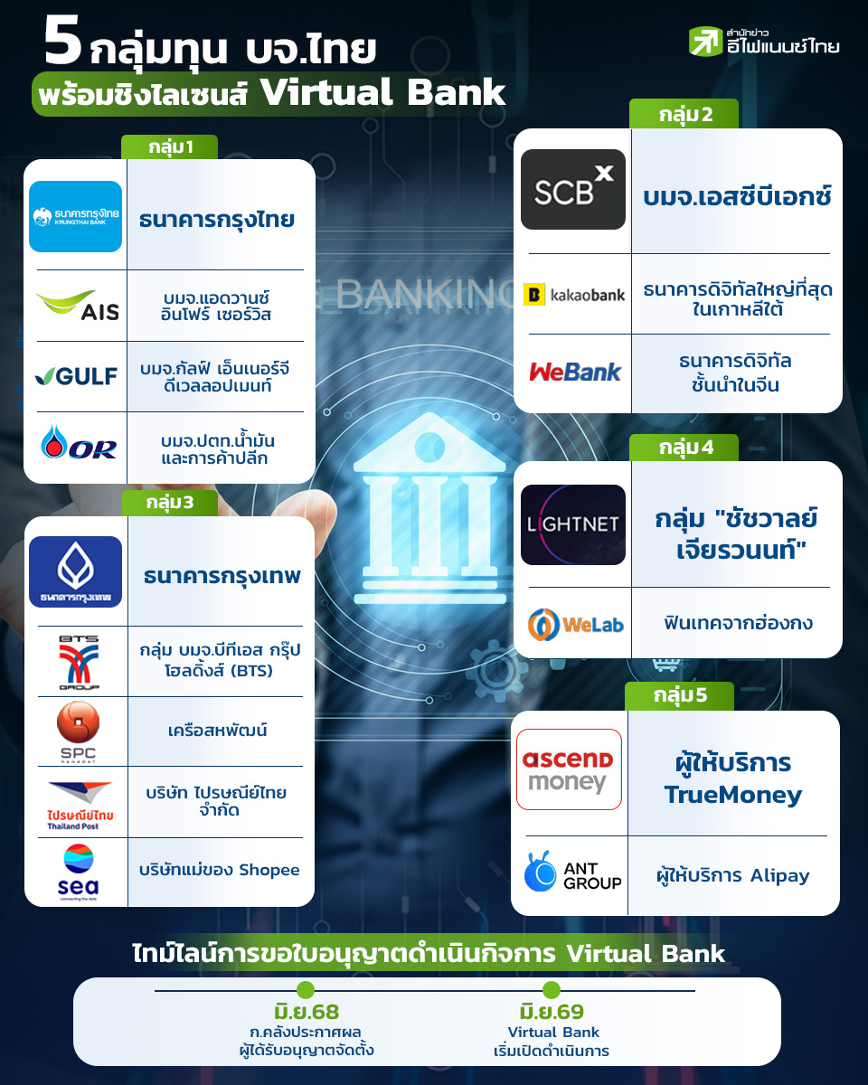 จับตากลุ่มทุนยักษ์ใหญ่บริษัทของไทยแห่ชิงใบอนุญาต (ไลเซนส์) ประกอบธุรกิจธนาคารพาณิชย์ไร้สาขา (Virtual Bank) ภายหลังธนาคารแห่งประเทศไทย (ธปท.) ปิดรับคำขอและประกาศมีผู้สนใจยื่นสมัครทั้งหมดรวม 5 ราย พร้อมคาดว่าจะสามารถประกาศรายชื่อผู้ที่ได้รับความเห็นชอบจากรัฐมนตรีว่าการกระทรวงการคลังให้จัดตั้ง Virtual Bank ได้ภายในช่วงกลางปี 68 ซึ่งผู้ที่ได้รับความเห็นชอบจะต้องเตรียมความพร้อมเพื่อให้สามารถเปิดดำเนินธุรกิจได้ภายใน 1 ปี นับแต่วันที่รัฐมนตรีให้ความเห็นชอบ ถึงแม้ว่า ทางธปท.เองจะยังไม่ได้เปิดเผยชื่อออกมา