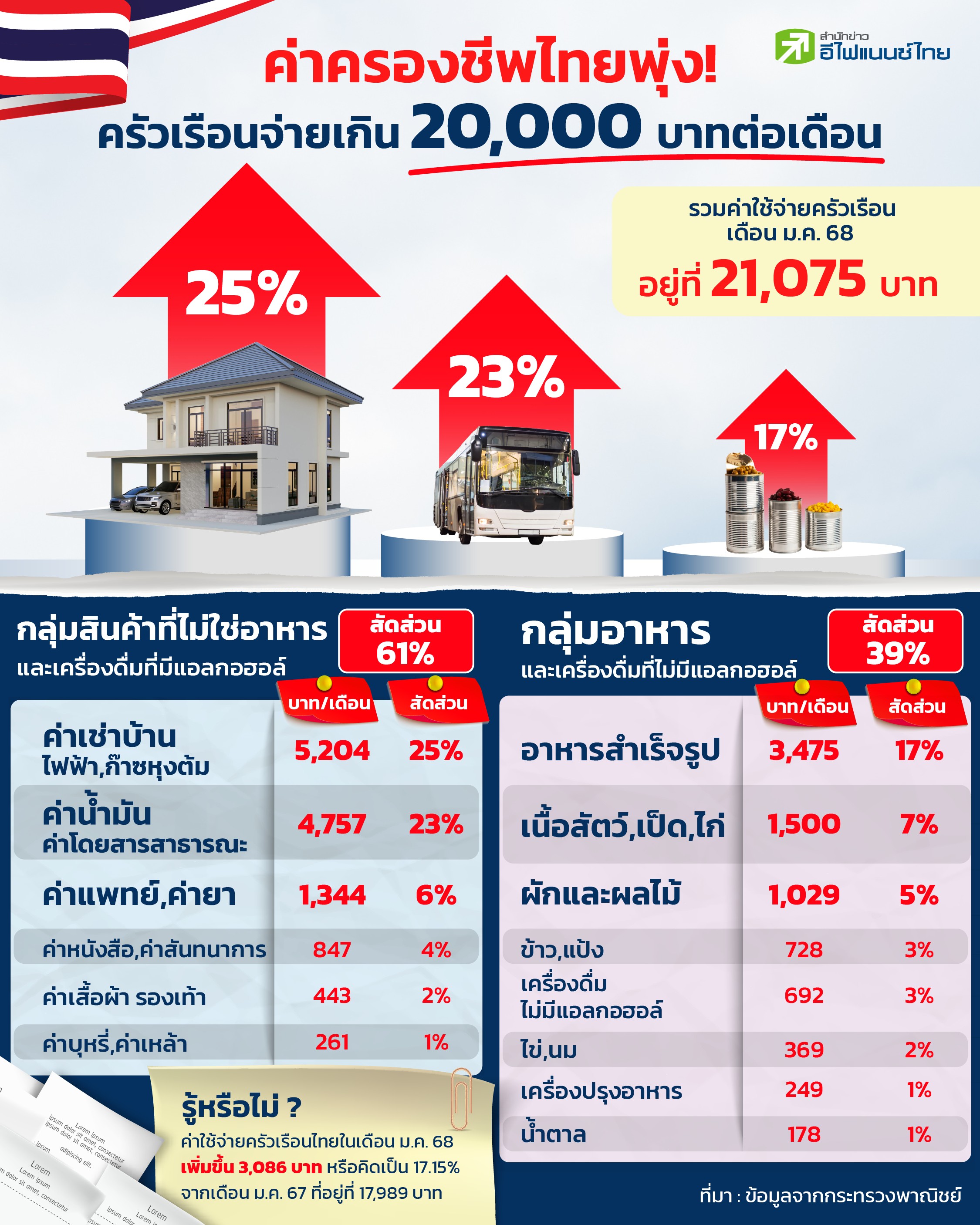 ในเดือน ม.ค. ที่ผ่านมา กระทรวงพาณิชย์ ได้รายงานดัชนีราคาผู้บริโภคทั่วไปของไทยในเดือน ม.ค. นี้ โดยอยู่ที่ 100.57 เมื่อเทียบกับช่วงเดียวกันของปีก่อนที่ 99.26 และทำให้อัตราเงินเฟ้อทั่วไปสูงขึ้น 1.32% เมื่อเทียบกับช่วงเดียวกันของปีก่อน โดยพบว่า มาจากการสูงขึ้นของราคาสินค้าในหลายรายการที่เพิ่มเพิ่มขึ้น โดยเฉพาะในกลุ่มอาหารและเครื่องดื่ม และเครื่องดื่มไม่มีแอลกอฮอล์ เป็นสำคัญ โดยในวันนี้ “สำนักข่าวอีไฟแนนซ์ไทย” ได้ทำการรวบรวมค่าใช้จ่ายครัวเรือน ในเดือน ม.ค. 68 โดยพบว่า ค่าใช้จ่ายสูงขึ้นมาอยู่ที่ระดับ