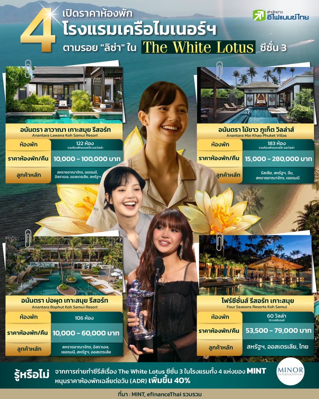 กระแสซีรีย์ The White Lotus ซีซั่น 3 ยังคงแรงไม่แผ่วโดยเฉพาะในประเทศไทย จากการถ่ายทำในแหล่งท่องเที่ยวที่สำคัญของประเทศไทย อย่าง เกาะสมุย, ภูเก็ต เป็นต้น ซึ่งภายในภาคนี้มีนักแสดงไทยและเทศร่วมแสดงด้วยมากมาย โดยเฉพาะคนที่เป็นกระแสมากที่สุด "ลิซ่า-ลลิษา มโนบาล" ส่งผลให้การท่องเที่ยวเชิงลักซ์ชัวรี่ตามรอยกระแสซีรีย์ และลิซ่า เป็นที่นิยมเพิ่มมากขึ้น โดย บริษัท ไมเนอร์ อินเตอร์เนชั่นแนล จำกัด (มหาชน) หรือ MINT ถือว่าได้รับอานิสงส์เต็มๆ จากซีรีย์เรื่องนี้ เนื่องจากซีรีย์ดังกล่าวใช้สถานที่ในเครือไมเนอร์ฯ