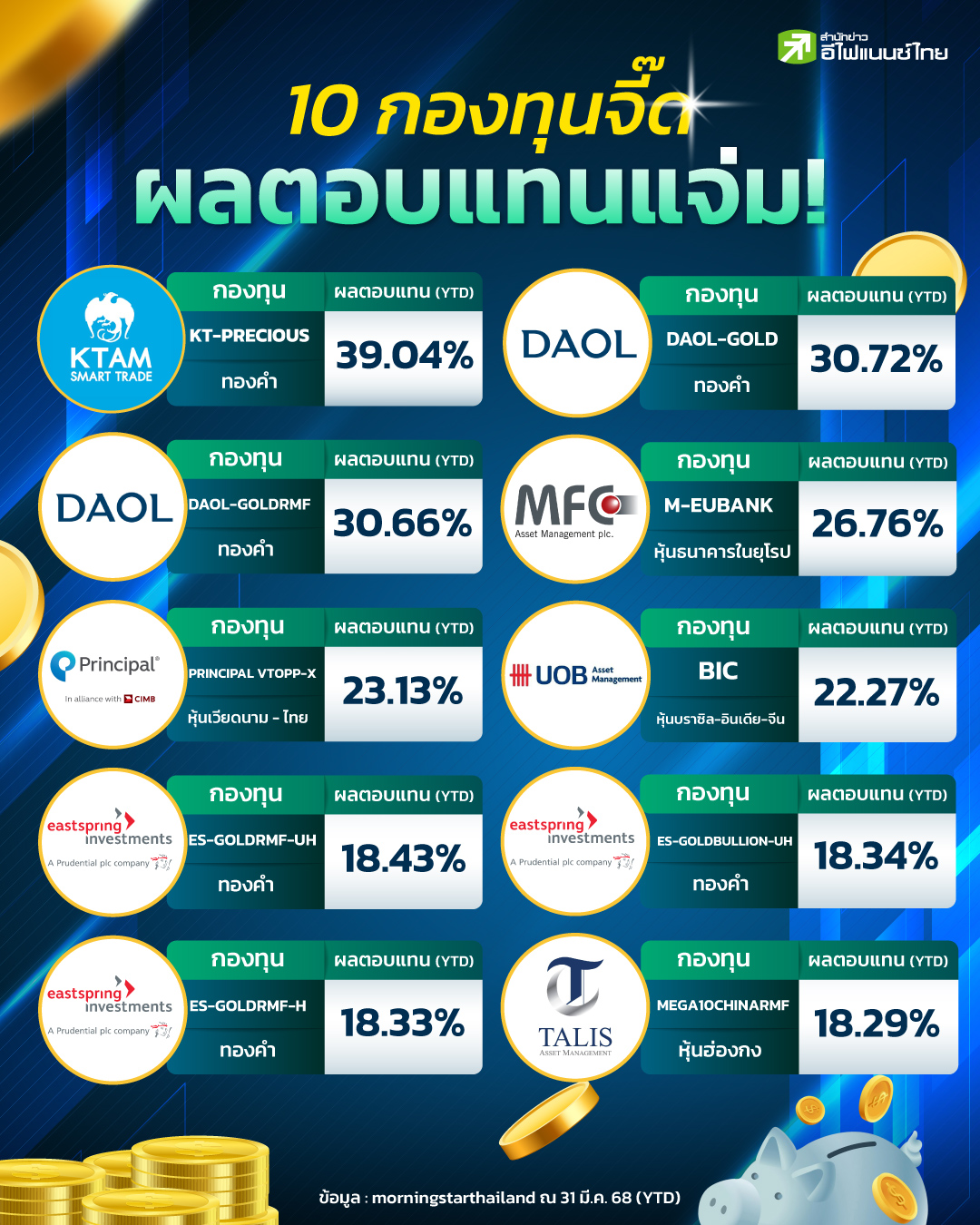 ผ่านมาแล้ว 1 ไตรมาส สำหรับปี 68 ซึ่งผลตอบแทนสินทรัพย์ทั่วโลกในช่วงนี้ที่เป็นหนึ่งในกระแสร้อนแรง นั้นคือราคาทองคำที่ปรับเพิ่มขึ้นทำนิวไฮอย่างต่อเนื่อง โดยล่าสุดปรับตัวเพิ่มขึ้นเหนือระดับ 3,130 ดอลลาร์/ออนซ์ หรือคิดเป็นปรับเพิ่มขึ้นกว่า 500 ดอลลาร์/ออนซ์ (YTD) หรือกว่า 19% ด้านทองคำแท่งในประเทศเพิ่มขึ้นเหนือ 50,000 บาท หรือเพิ่มขึ้นประมาณ 8,200 บาท (YTD) หรือกว่า 19% เช่นกัน ส่งผลบวกต่อนักลงทุนที่มีสินทรัพย์ประเภทดังกล่าว โดยหนึ่งในนั้นคือการลงทุนในกองทุน ซึ่งจากการสำรวจในช่วงไตรมาส 1/68 ข้อมูลจาก