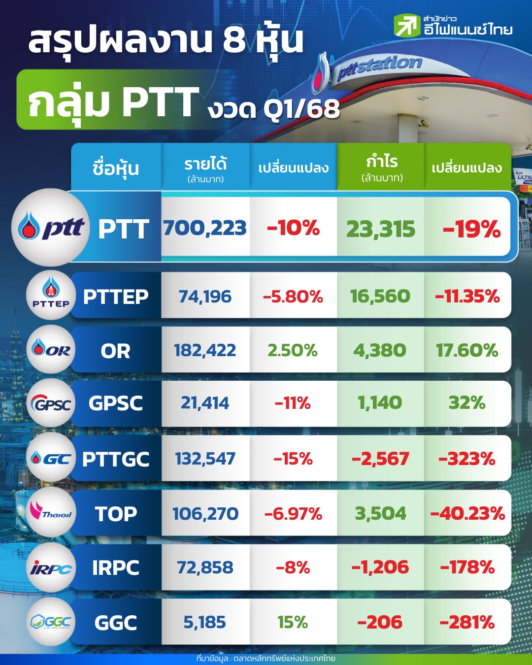 กลุ่มบริษัทในเครือ บมจ. ปตท. (PTT) ซึ่งเป็นหนึ่งในเสาหลักของอุตสาหกรรมพลังงานและปิโตรเคมีของไทย ได้ทยอยรายงานผลประกอบการประจำไตรมาส 1/68 ครบทั้ง 8 บริษัทแล้ว ได้แก่ บมจ. โกลบอลกรีนเคมิคอล (GGC), บมจ. โกลบอล เพาเวอร์ ซินเนอร์ยี่ (GPSC), บมจ. ไออาร์พีซี (IRPC), บมจ. ปตท. น้ำมันและการค้าปลีก (OR), บมจ. ไทยออยล์ (TOP), บมจ. ปตท. สำรวจและผลิตปิโตรเลียม (PTTEP), บมจ. พีทีที โกลบอล เคมิคอล (PTTGC) และบริษัทแม่อย่าง บมจ. ปตท. (PTT) อย่างไรก็ตามแม้หลายบริษัทจะยังคงมีกำไร แต่ภาพรวมแสดงให้เห็นถึงความท้าทายของกลุ่มพลังงานในปีนี้