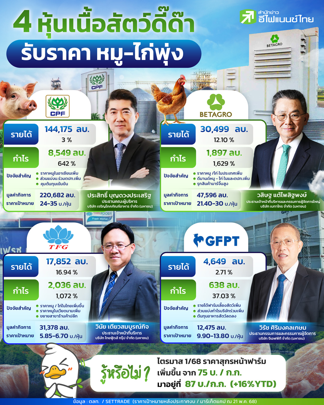เป็นกลุ่มหุ้นที่มีผลงานไตรมาสแรกของปีโดดเด่น จากปัจจัยบวกเรื่องราคาหมู-ไก่ที่เพิ่มขึ้น นั่นคือหุ้นกลุ่มธุรกิจเนื้อสัตว์ ได้แก่ CPF - BTG - TFG - GFPT ที่โชว์งบไตรมาส 1/2568 สดใส สะท้อนแรงหนุนจากต้นทุนวัตถุดิบที่เป็นใจ ขณะที่โบรกฯ เริ่มทยอยปรับเพิ่มราคาเป้าหมายปี 2568 รับแนวโน้มราคาสุกรและไก่ขาขึ้น "สำนักข่าวอีไฟแนนซ์ไทย" รวบรวมภาพรวมการดำเนินงานและมุมมองล่าสุดของนักวิเคราะห์ต่อ 4 หุ้นเด่นในกลุ่มเนื้อสัตว์ ดังนี้ บริษัท เจริญโภคภัณฑ์อาหาร จำกัด (มหาชน) หรือ CPF , บริษัท เบทาโกร จำกัด (มหาชน)