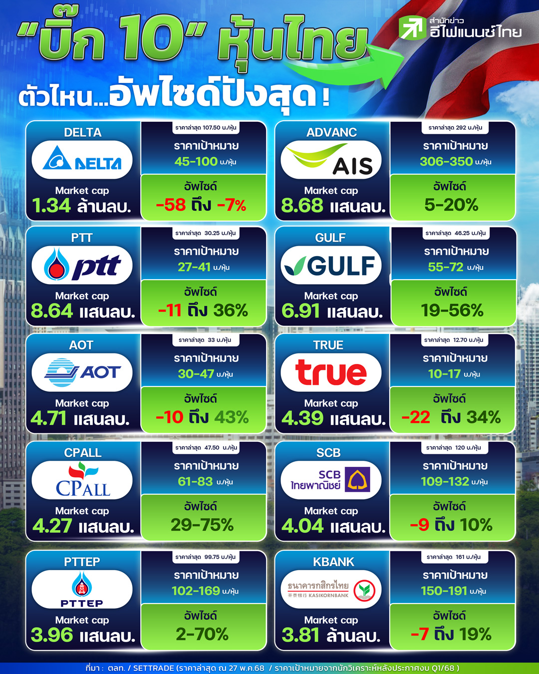 จากภาวะตลาดหุ้นไทยในรอบ 5 เดือนของปีนี้ ที่ปรับลดลงอย่างหนักจากภาวะเศรษฐกิจที่ชะลอตัว และความกังวลเรื่องมาตรการภาษีการค้าสหรัฐฯ ส่งผลให้หุ้นขนาดใหญ่ชั้นนำของไทย ถูกเทขายออกมาอย่างต่อเนื่อง "สำนักข่าวอีไฟแนนซ์ไทย" จึงชวนนักลงทุนมาสำรวจ 10 หุ้นไทย ที่มีมูลค่าการตลาดสูงสุด ซึ่งถือว่าเป็นหุ้นที่มีความมั่นคงเป็นอันดับต้นของตลาด และส่วนใหญ่เป็นหุ้นที่มักจะถูกนักลงทุนจับตาเป็นอันดับแรก ว่าในช่วง 5 เดือนที่ผ่านราคาปรับขึ้นหรือลดลงมามากแค่ไหน และเมื่อเทียบกับมุมมองของนักวิเคราะห์ ที่ประเมินออกมาล่าสุด