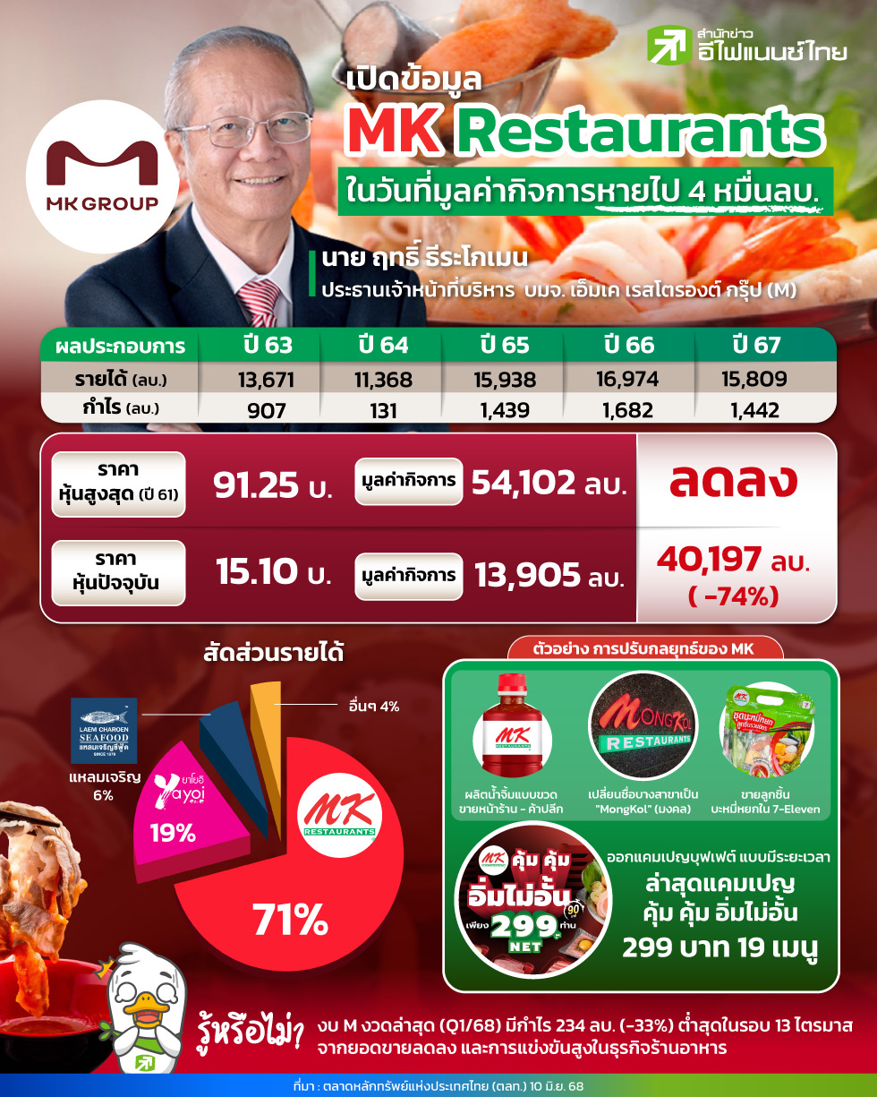 หากพูดถึง “สุกี้” ในไทย หนึ่งในแบรนด์ที่ผู้บริโภคนึกถึงเป็นลำดับต้น ๆ คงหนีไม่พ้น บมจ. เอ็มเค เรสโตรองต์ กรุ๊ป (M) หรือ MK Restaurant ที่อยู่คู่ตลาดมาหลายสิบปี โดยปัจจุบัน MK ครองส่วนแบ่งตลาดสุกี้-ชาบูในไทยถึง 60% จากมูลค่าตลาดรวมประมาณ 23,000–25,000 ล้านบาท อย่างไรก็ตาม แม้ครองใจผู้บริโภคมายาวนาน แต่การแข่งขันในธุรกิจร้านอาหารที่ทวีความรุนแรง โดยเฉพาะจากแบรนด์สุกี้-ชาบูราคาประหยัด ทำให้ MK ต้องเร่งปรับกลยุทธ์ครั้งใหญ่เพื่อรักษาฐานลูกค้าและตำแหน่งผู้นำ โดยสิ่งที่น่าจับตาคือมูลค่ากิจการของ