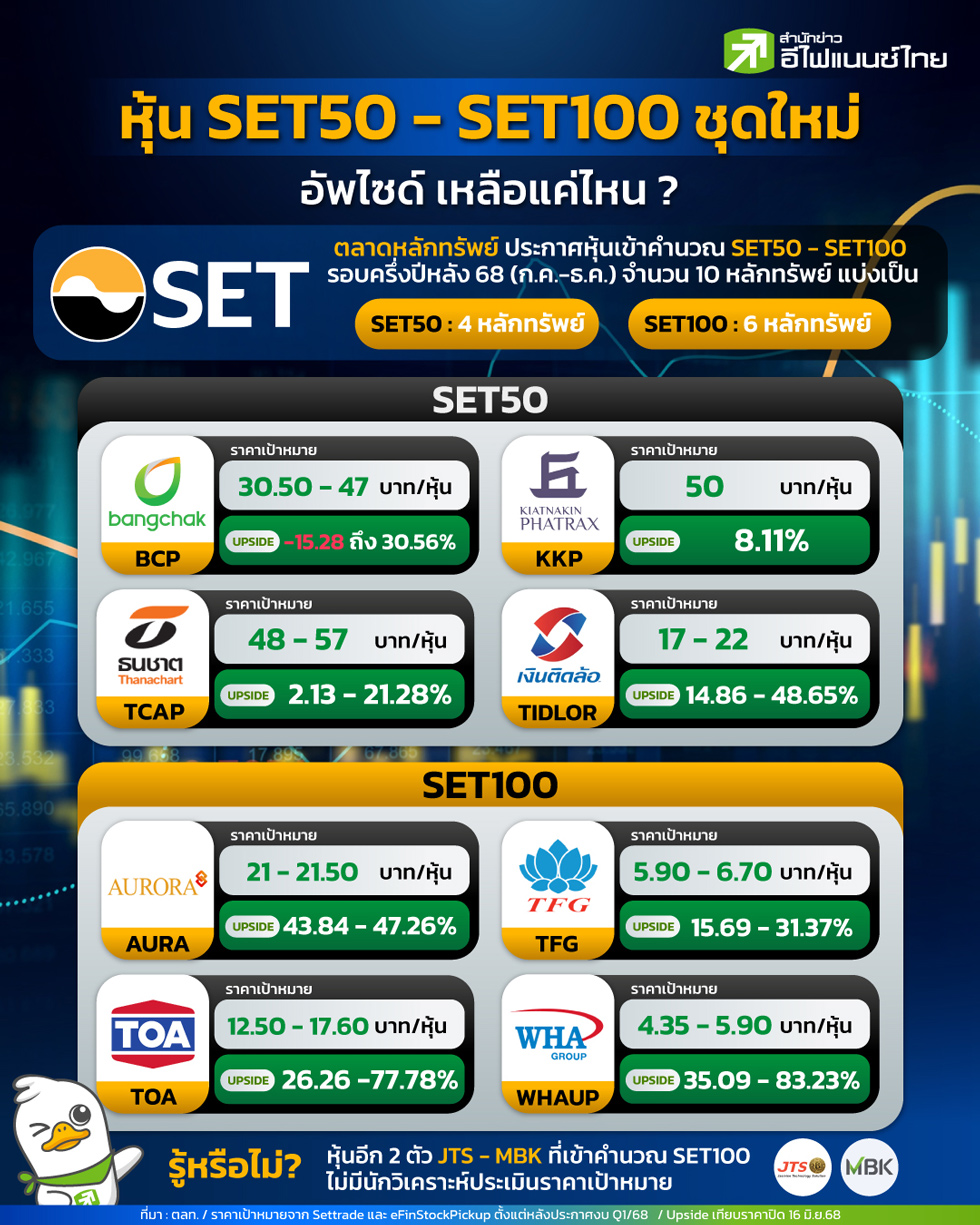 ตลาดหลักทรัพย์แห่งประเทศไทย(ตลท.) ประกาศปรับเปลี่ยนรายชื่อหุ้นในดัชนี SET50 และ SET100 รอบครึ่งปีหลัง 2568 ที่จะมีผลตั้งแต่ 1 ก.ค. - 31 ธ.ค. 68 มีหุ้นเข้าใหม่รวม 10 บริษัท ได้แก่ BCP, KKP, TCAP, TIDLOR ใน SET50 และ AURA, TFG, TOA, WHAUP, JTS, MBK ใน SET100 อย่างไรก็ตามอัพไซด์ของหุ้นกลุ่มนี้ยังเหลืออยู่แค่ไหน หรือราคาหุ้นวิ่งไปมากแล้ว "สำนักข่าวอีไฟแนนซ์ไทย" จึงรวบรวมข้อมูลเปรียบเทียบราคาหุ้น ณ ปัจจุบัน กับราคาเป้าหมายล่าสุดจากนักวิเคราะห์ เพื่อประเมินอัพไซด์ที่ยังเหลืออยู่ของหุ้นแต่ละตัว
