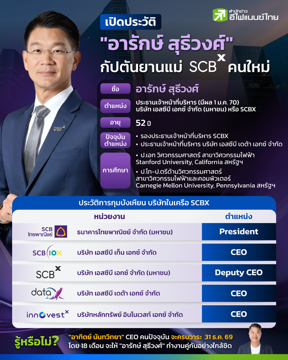 บริษัท เอสซีบี เอกซ์ จำกัด (มหาชน) หรือ SCBX ประกาศแต่งตั้ง ดร.อารักษ์ สุธีวงศ์ เป็นประธานเจ้าหน้าที่บริหารคนใหม่ มีผลตั้งแต่วันที่ 1 ม.ค.70 โดยในช่วง 18 เดือนข้างหน้า นายอาทิตย์ นันทวิทยา ซีอีโอคนปัจจุบัน จะทำงานร่วมกับดร.อารักษ์อย่างใกล้ชิด เพื่อส่งไม้ต่อและขับเคลื่อนยุทธศาสตร์องค์กรให้เปลี่ยนผ่านได้อย่างต่อเนื่องและมั่นคง ทั้งนี้ดร.อารักษ์ถือเป็นหนึ่งในผู้บริหารหลักของกลุ่ม SCBX ซึ่งปัจจุบันดำรงตำแหน่งรองประธานเจ้าหน้าที่บริหาร SCBX และซีอีโอของ SCB DataX มีบทบาทสำคัญในการพัฒนาเทคโนโลยีด้าน Data,