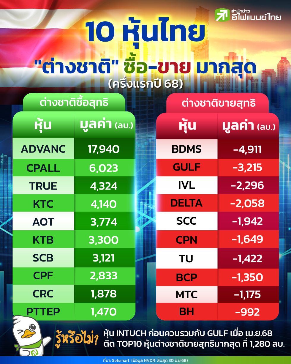 เจาะลึกพอร์ตต่างชาติ! ครึ่งแรกปี 68 ต่างชาติซื้อ–ขายหุ้นไทยตัวไหนบ้าง? ครึ่งปีแรกของตลาดหุ้นไทย ผ่านพ้นไปแล้ว แม้ว่าตลาดหุ้นไทยจะดิ่งลงหนักมาตลอดช่วงเวลาดังกล่าว และนักลงทุนต่างชาติยังขายสุทธิหุ้นไทยอย่างหนักหน่วง ตั้งแต่ต้นปี 68 (ม.ค.–มิ.ย.) นักลงทุนต่างชาติยังคง "ขายสุทธิ" หุ้นไทยอย่างต่อเนื่อง รวมมูลค่ากว่า 78,692 ล้านบาท อย่างไรก็ตามหากลองลงไปดูในหุ้นรายตัว ยังพบว่ามีหลายตัวที่นักลงทุนต่างชาติซื้อสุทธิสวนทางกับภาพรวมตลาด "สำนักข่าวอีไฟแนนซ์ไทย" เปิด 10 หุ้นที่ต่างชาติ