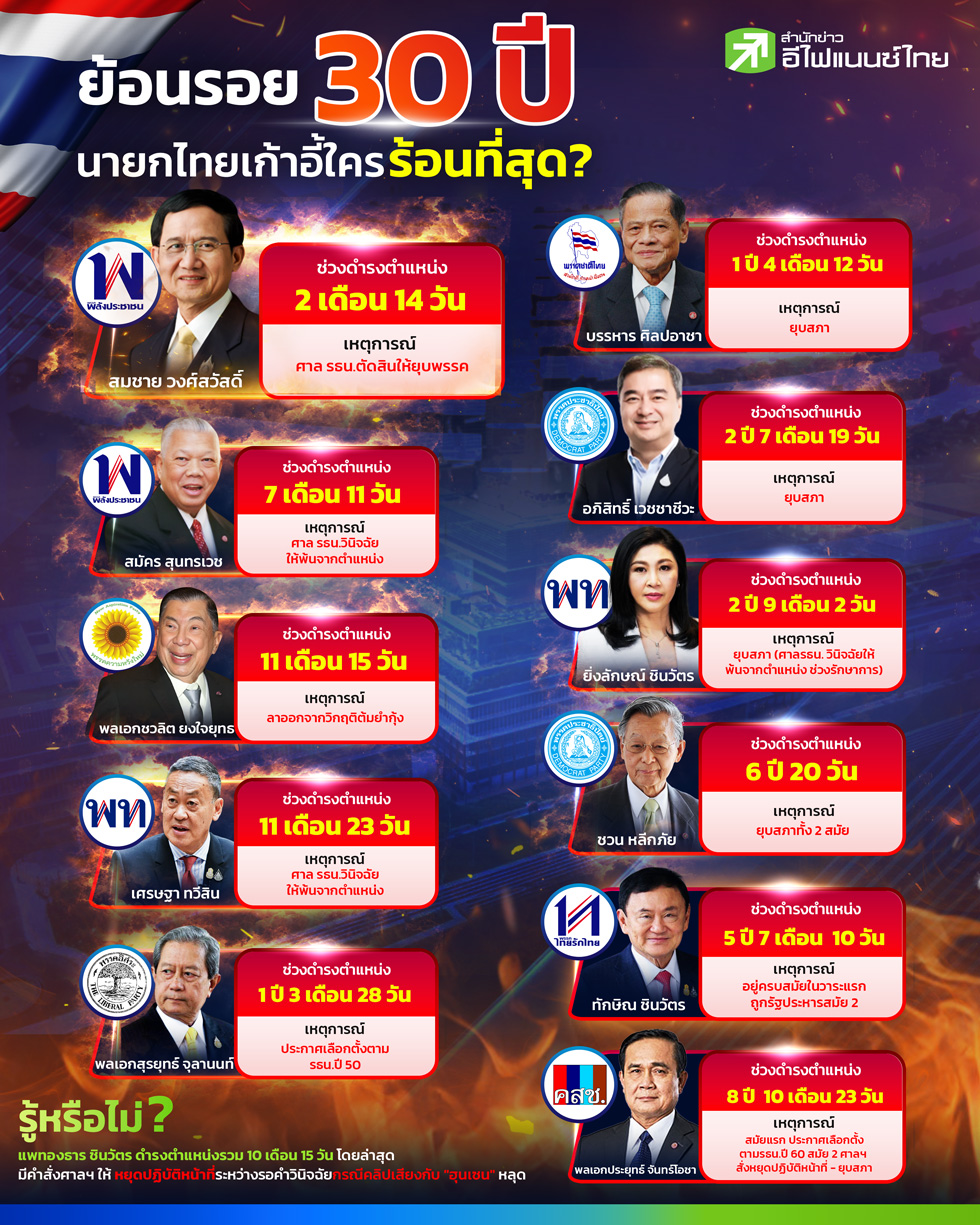 ตลอด 30 ปีที่ผ่านมา การเมืองไทย มีการเปลี่ยนแปลงผู้นำและเหตุการณ์สำคัญอย่างต่อเนื่อง ไม่ว่าจะเป็นการ ยุบสภา รัฐประหาร วิกฤตเศรษฐกิจ ไปจนถึง คำวินิจฉัยของศาลรัฐธรรมนูญ ที่ส่งผลโดยตรงต่อการดำรงตำแหน่งของนายกรัฐมนตรี โดยล่าสุดเอง “นางสาวแพทองธาร ชินวัตร” ก็ต้องหยุดปฏิบัติหน้าที่ จากคำสั่งศาลฯ เช่นเดียวกัน หลังจากรอการพิจารณากรณีของคลิปเสียงหลุดกับ “ฮุนเซน” ในวันนี้ “สำนักข่าวอีไฟแนนซ์ไทย” ได้ทำการรวบรวมการดำรงตำแหน่งนายกรัฐมนตรีของไทย ซึ่งพบว่า มีผู้นำหลายคนที่ต้องพ้นตำแหน่งก่อนครบวาระ