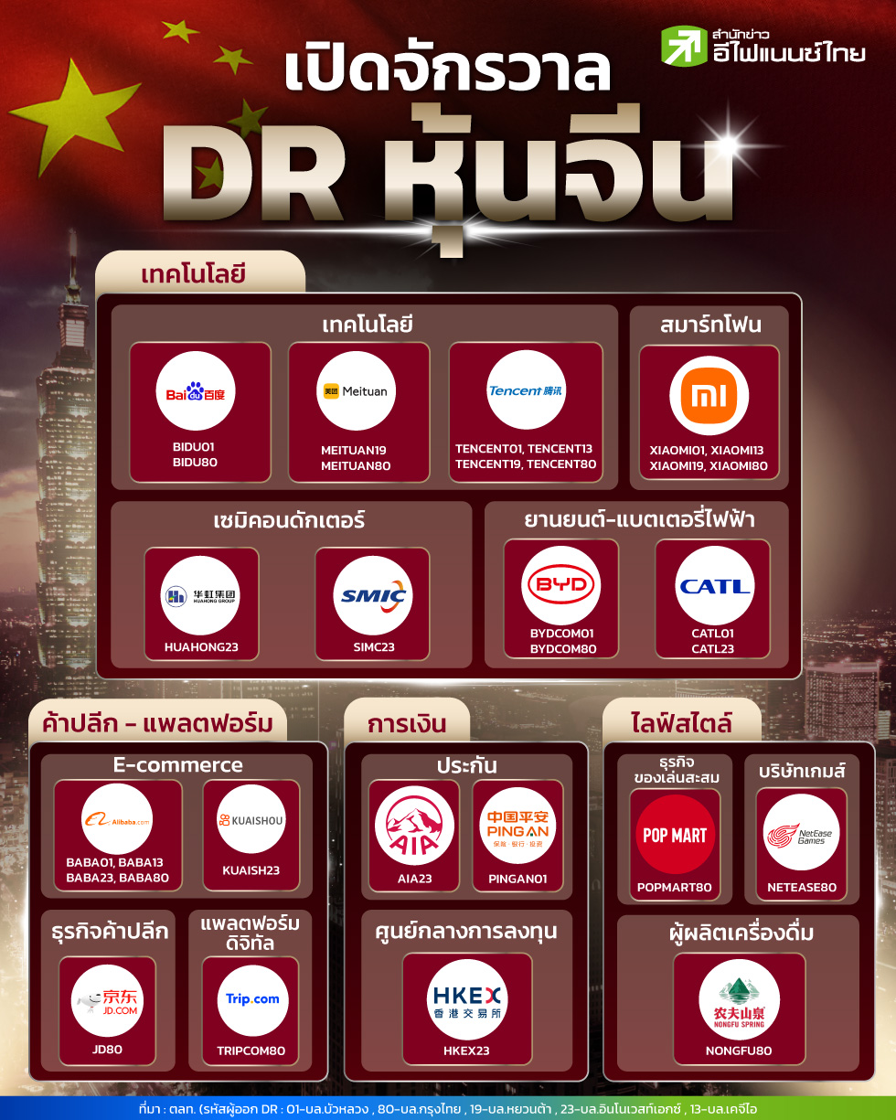 หากคุณกำลังมองหาวิธีลงทุนในหุ้นต่างประเทศโดยไม่ต้องเปิดบัญชีข้ามประเทศ “DR” หรือ Depositary Receipt คือหนึ่งในเครื่องมือการลงทุนที่น่าสนใจ ซึ่งช่วยให้นักลงทุนไทยสามารถซื้อขายหุ้นต่างประเทศผ่านตลาดหลักทรัพย์ไทยได้ง่ายๆ โดย “สำนักข่าวอีไฟแนนซ์ไทย” ได้สรุปหุ้นจีน-ฮ่องกง ในแต่ละกลุ่มอุตสาหกรรมที่สามารถลงทุนผ่าน DR ได้อย่างชัดเจน สำหรับในกลุ่มเทคโนโลยีมีตัวเลือกยอดนิยมอย่าง BAIDU (BIDU) , MEITUAN (MEITUAN) , TENCENT HOLDINGS (TENCENT) หรือจะเป็นสมาร์ทโฟน อย่าง XIAOMI CORPORATION