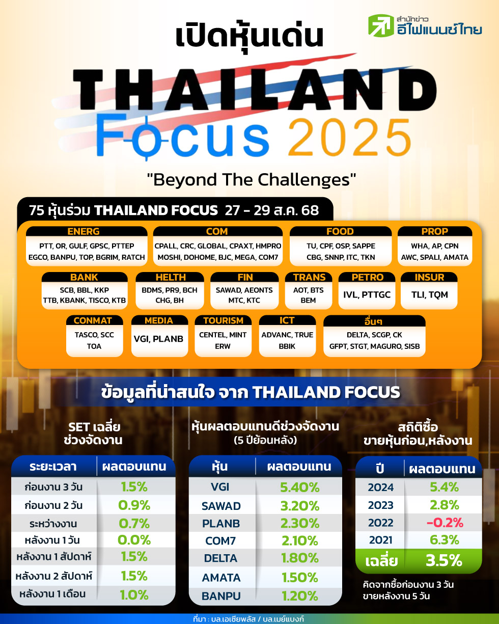 สำหรับงาน THAILAND FOCUS 2025 ปีนี้เริ่มขึ้นแล้ว ซึ่งส่วนใหญ่ตลาดหุ้นไทยปรับตัวเพิ่มขึ้นตอบรับงานดังกล่าว โดยบล. เมย์แบงก์ (ประเทศไทย) จำกัด (มหาชน) เปิดเผยว่า Thailand Focus ถือเป็นเวทีสำคัญที่เปิดโอกาสให้นักลงทุนสถาบันทั้งใน และต่างประเทศได้พบปะกับบริษัทจดทะเบียนโดยตรง ซึ่งสร้างโอกาสในการเก็งกำไรหุ้นไทยระยะสั้น โดยจากสถิติในช่วงหลัง COVID-19 (ปี 2564 - 2567) พบว่า SET Index มักให้ผลตอบแทนเชิงบวกเฉลี่ย 0.7% ระหว่างการจัดงาน และสามารถปรับขึ้นต่ออีกเฉลี่ย 1.5% ในช่วง 5 วันทำการถัดไป ด้วยความน่าจะเป็นสูงถึง