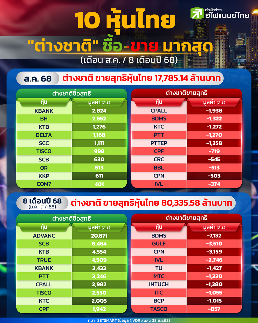 ตลาดหุ้นไทย (SET INDEX) เดือน ส.ค.68 ที่ผ่านมาแม้ว่าตลาดจะเริ่มทรงๆตัว แต่กลับพบว่านักลงทุนต่างชาติยังคง "ขายหุ้นไทย" อย่างหนักหน่วง โดยในช่วงเดือน ส.ค.68 นักลงทุนต่างชาติขายสุทธิประมาณ 17,785.14 ล้านบาท และนับตั้งแต่ต้นปีถึงปัจจุบัน (1 ม.ค.– 28 ส.ค.68) นักลงทุนต่างชาติมีสถานะขายสุทธิอย่างต่อเนื่อง รวมมูลค่ากว่า 80,335.58 ล้านบาท ทั้งนี้หากลองลงไปดูในข้อมูล NVDR พบว่าหุ้น 10 ตัวแรกที่ต่างชาติซื้อมากที่สุดในช่วงเดือน ส.ค.68 กระจายอยู่ในกลุ่มธนาคารพาณิชย์,โรงพยาบาล,ชิ้นส่วนอิเล็กทรอนิกส์,วัสดุก่อสร้าง,น้ำมัน