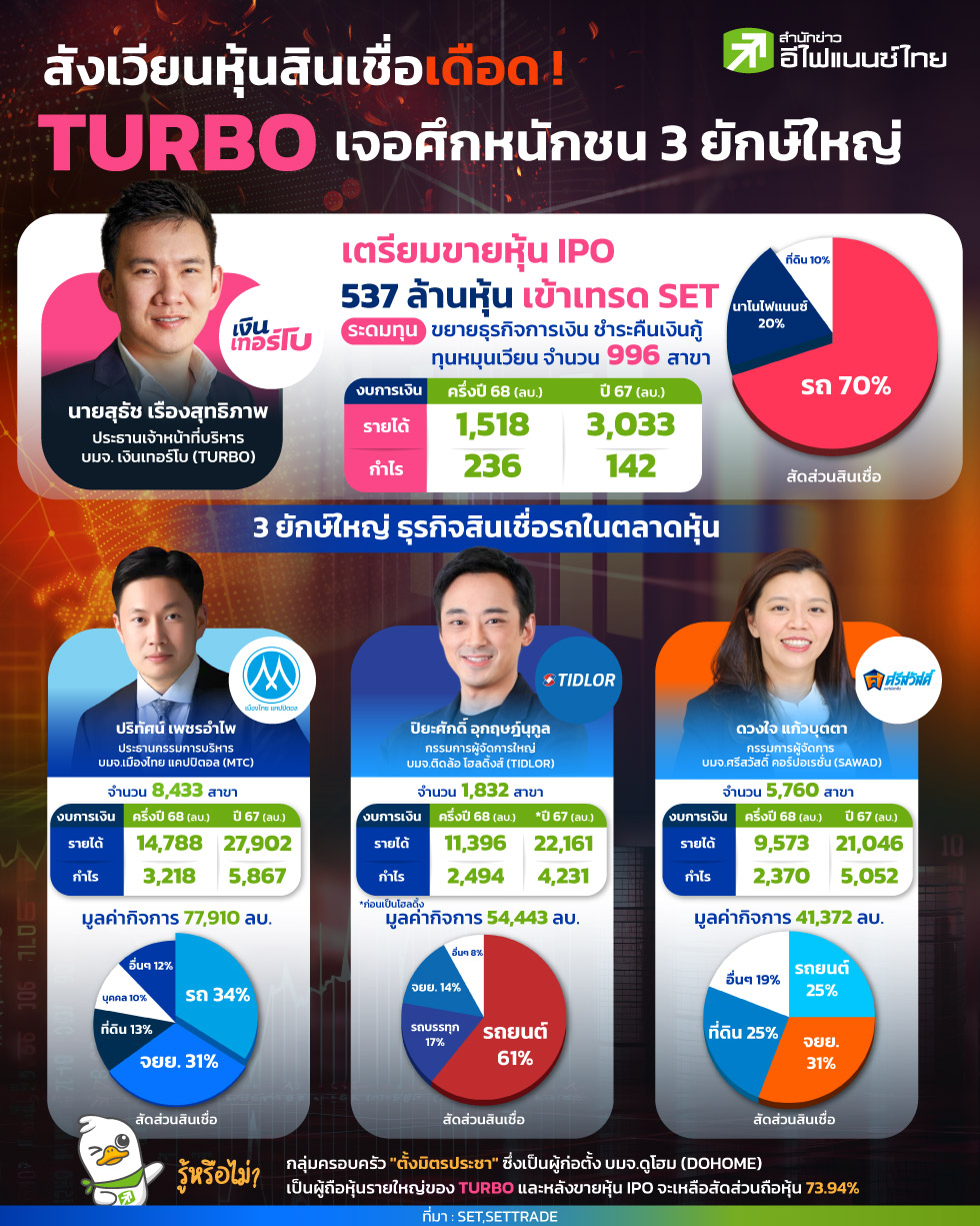 วงการหุ้นกลุ่มสินเชื่อร้อนแรงขึ้นทันที เมื่อบมจ. เงินเทอร์โบ (TURBO) เตรียมเข้าซื้อขายในตลาดหลักทรัพย์ฯ ซึ่งการเข้ามาของผู้เล่นรายใหม่นี้ ถือเป็นการท้าชน 3 ยักษ์ใหญ่ที่ครองตลาดมานาน ได้แก่ บมจ.เมืองไทย แคปปิตอล (MTC), บมจ.ติดล้อ โฮลดิ้งส์ (TIDLOR) และ บมจ.ศรีสวัสดิ์ คอร์ปอเรชั่น (SAWAD) เจ้าตลาดรุ่นเก๋าที่ต่อยอดธุรกิจไปหลายด้าน ทั้งไฟแนนซ์ จำนำทะเบียน ไปจนถึงการร่วมทุนกับสถาบันการเงิน ทำให้มีโครงสร้างธุรกิจที่แข็งแรง โดย TURBO ผู้ท้าชิงรายใหม่ ดำเนินธุรกิจสินเชื่อจำนำทะเบียนรถและสินเชื่อเช่าซื้อเป็นหลัก