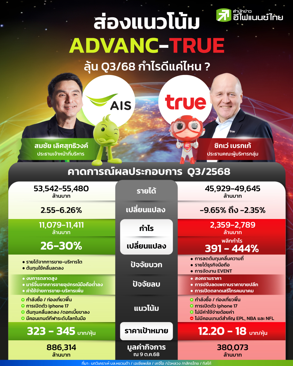 ใกล้จะถึงช่วงฤดูของการประกาศผลการดำเนินงานของบริษัทจดทะเบียน (บจ.) ในตลาดหลักทรัพย์แห่งประเทศไทย (ตลท.) ส่งผลให้ขณะนี้บริษัทหลักทรัพย์ (บล.) เริ่มทยอยออกมาคาดการณ์งบการดำเนินงานของบริษัทในช่วงไตรมาส 3/2568 ว่าแต่ละบริษัทจะมีรายได้ และกำไรเท่าไหร่ มีปัจจัยบวกอะไรที่เข้ามาสนับสนุนการดำเนินงานบ้าง โดยในวันนี้ “สำนักข่าวอีไฟแนนซ์ไทย” ได้ทำการรวบรวมการคาดการณ์งบสื่อสาร 2 ค่ายดัง นั่นก็คือ บมจ. แอดวานซ์ อินโฟร์ เซอร์วิส หรือ ADVANC และ บมจ.ทรู คอร์ปอเรชั่น หรือ TRUE มาให้นักลงทุนได้รับทราบกันในเบื้องต้น