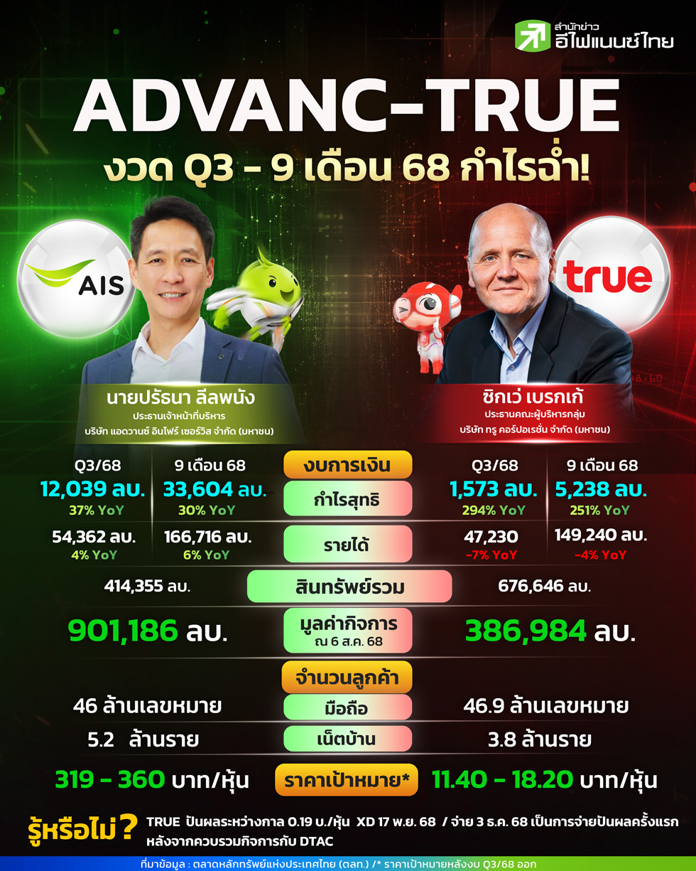 หุ้นสื่อสารรายใหญ่ในประเทศไทยทั้งบมจ.แอดวานซ์ อินโฟร์ เซอร์วิส (ADVANC) และ บมจ. ทรู คอร์ปอเรชั่น(TRUE)ต่างรายงานผลประกอบการไตรมาส 3/68 ออกมาแล้ว โดยผลงานกำไรค่อนข้างแข็งแกร่ง โดยเฉพาะ TRUE ที่สามารถทำกำไรสุทธิได้อย่างต่อเนื่องเป็นไตรมาสที่สาม และประกาศจ่ายเงินปันผลระหว่างกาลเป็นครั้งแรกหลังควบรวมกิจการ ขณะที่ ADVANC โชว์ฟอร์มแกร่งด้วยกำไรที่เติบโตสูงกว่าที่ตลาดคาดการณ์ไว้ โดย ADVANC รายงานกำไรสุทธิใน Q3/68 ที่ 12,038.86 ล้านบาท เติบโตสูงถึง 37% จากช่วงเดียวกันของปีก่อน และสูงกว่าประมาณการของนักวิเคราะห์