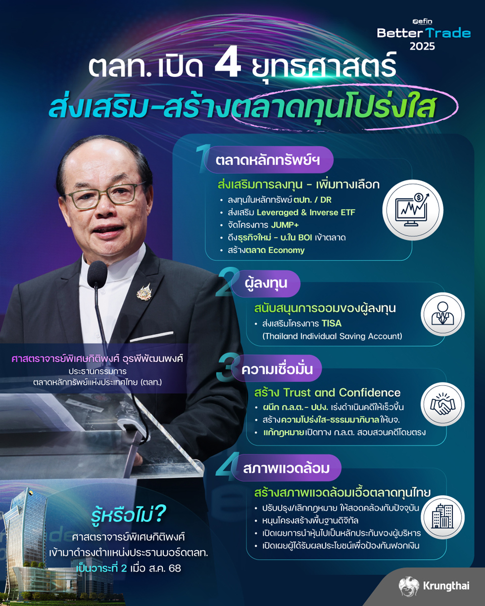"ศาสตราจารย์พิเศษกิติพงศ์ อุรพีพัฒนพงศ์ ประธานกรรมการ ตลาดหลักทรัพย์แห่งประเทศไทย (ตลท.)" ที่กล่าวในงาน Better Trade 2025 ช่วง Opening Session "Intelligent Investor" โดยมีสาระสำคัญคือเรื่องบทบาทหน้าที่ของตลาดหลักทรัพย์ฯในการสนับสนุนนักลงทุนทุกฝ่ายอย่างมีประสิทธิภาพและให้ความรู้กับนักลงทุน เพราะนักลงทุนไทยมีความจำเป็นอย่างมากในการมีข้อมูลที่ครบถ้วน โดยเชื่อว่าการมีข้อมูลมากกว่าการคาดเดาหรือการเก็งกำไรสอดคล้องกับหลักการณ์ของเจ้าพ่อการลงทุนอย่าง "Benjamin Graham" ที่ระบุไว้ว่ารากฐานของการลงทุนอย่างมีเหตุผล