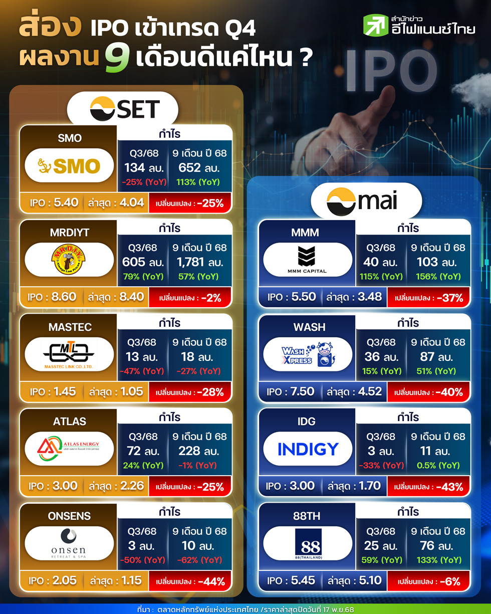 แม้ว่าในช่วงไตรมาส 4/68 ตลาดหลักทรัพย์แห่งประเทศไทยจะคึกคักไปด้วยการเข้าจดทะเบียนของบริษัทใหม่ (IPO) ถึง 9 แห่ง ได้แก่ - บริษัท กลุ่มสมอทอง จำกัด (มหาชน) หรือ SMO - บริษัท มิสเตอร์. ดี.ไอ.วาย. โฮลดิ้ง (ประเทศไทย) จำกัด (มหาชน) หรือ MRDIYT - บริษัท แมสเทค ลิ้งค์ จำกัด (มหาชน) หรือ MASTEC - บริษัท แอตลาส เอ็นเนอยี จำกัด (มหาชน) หรือ ATLAS - บริษัท ออนเซ็น รีทรีต แอนด์ สปา กรุ๊ป จำกัด (มหาชน) หรือ ONSENS - บริษัท เอ็มเอ็มเอ็ม แคปปิตอล จำกัด (มหาชน) หรือ MMM - บริษัท ลอนดรี้ ยู จำกัด (มหาชน) หรือ WASH