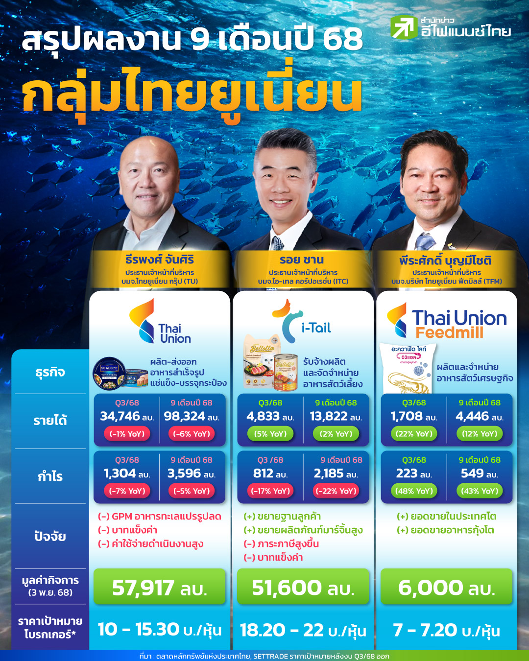 star_borderModal Upgrade Packageสรุปผลงาน 9 เดือนปี 68 กลุ่มไทยยูเนี่ยนTU, ITC, TFM ช่วง Q3/68 TU กำไร 1,304 ลบ. เดินหน้าลดค่าใช้จ่าย ส่วน ITC กำไรโตจากออเดอร์สหรัฐฯ ขณะ TFM กำไรทำสถิติสูงสุดจากอาหารกุ้ง-ปลา6 พ.ย. 2568 15:58 น.
